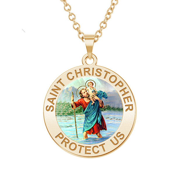 All Religious Medals are Customizable. We can change the spelling, your language, names etc, ex: change "Pray for Us" to "Pray For Me". Just let us know in "special instructions"Color Laser is a patent pending process, color is guaranteed to last foreverColor Medals can be worn in the pool, shower, etc. without affecting the image. We guarantee it.This 14k yellow gold Saint Christopher is the most popular saint worn by travelers.