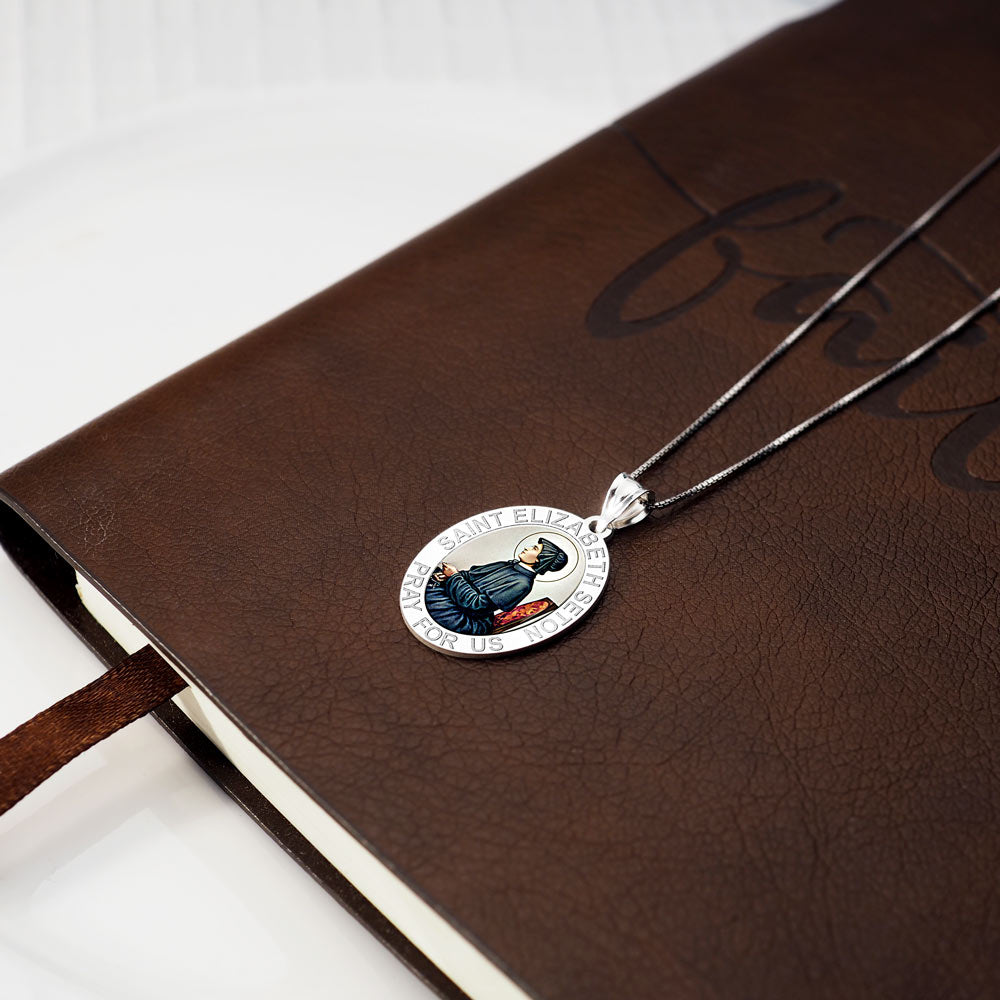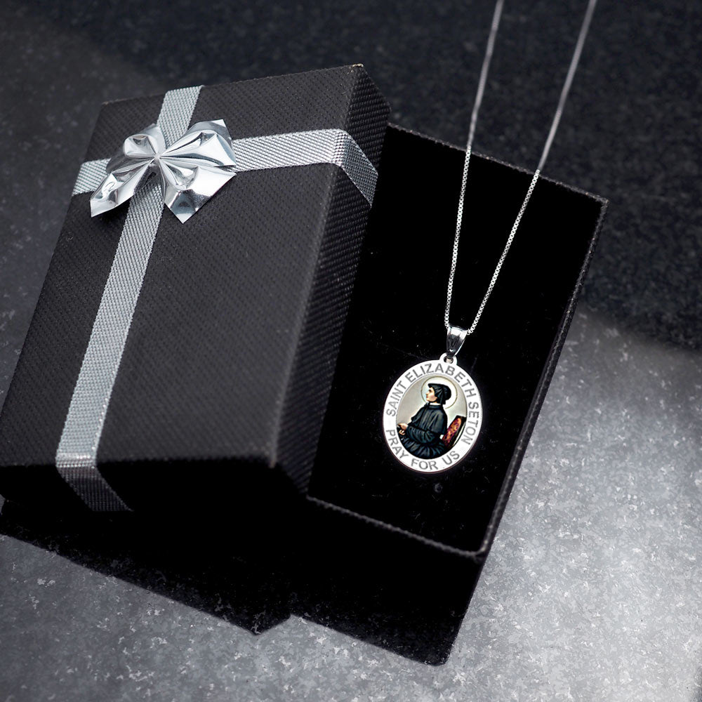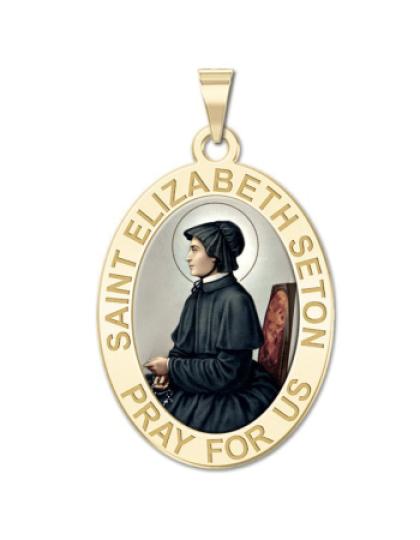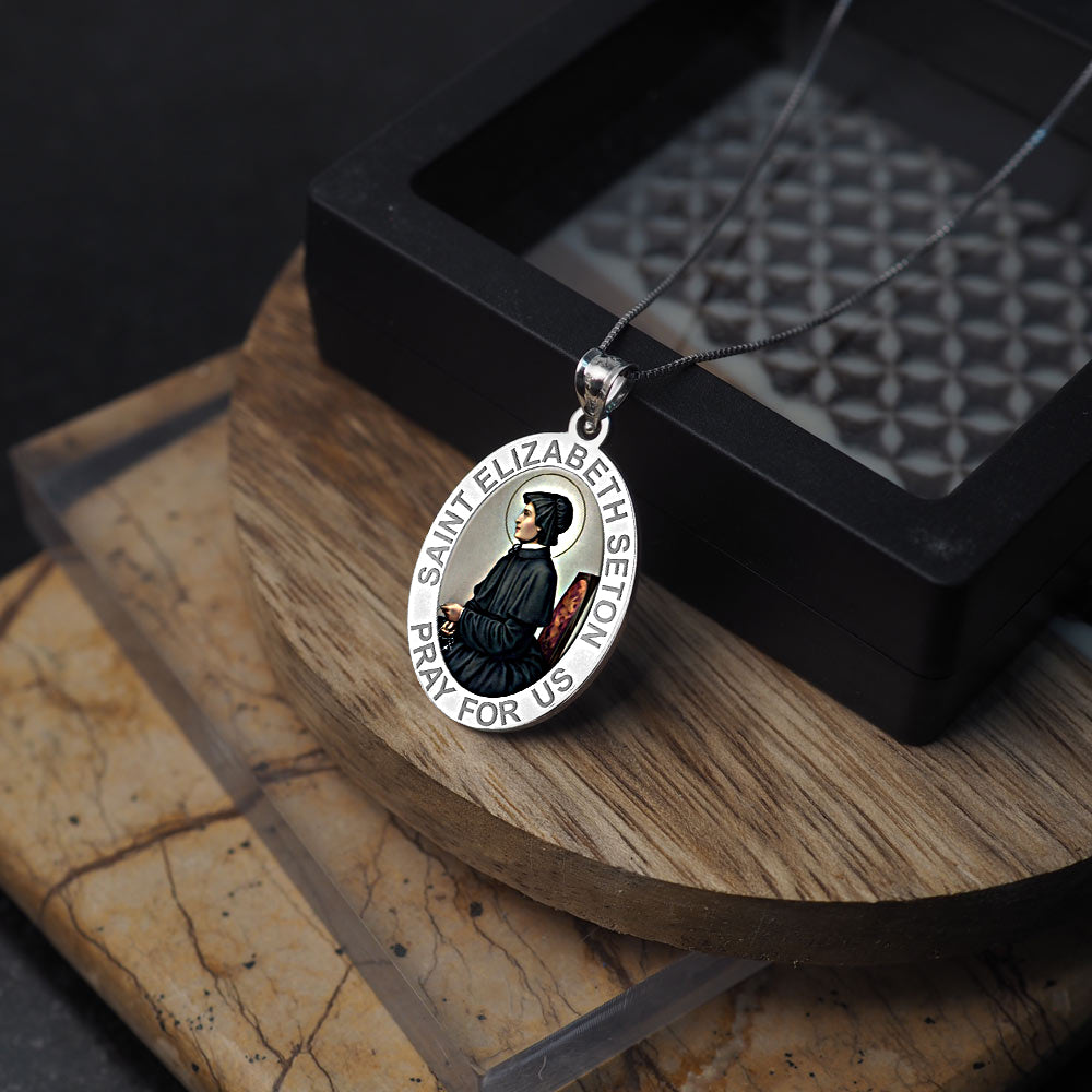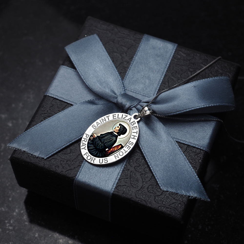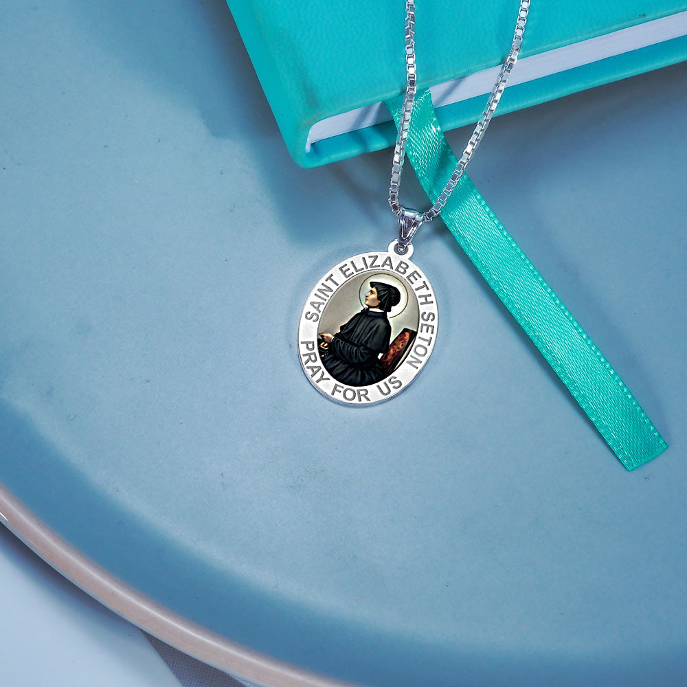 All Religious Medals are Customizable. We can change the spelling, your language, names etc, ex: change "Pray for Us" to "Pray For Me". Just let us know in "special instructions"Color Laser is a patent pending process, color is guaranteed to last foreverColor Medals can be worn in the pool, shower, etc. without affecting the image. We guarantee it.Elizabeth Ann Bayley Seton (August 28, 1774 January 4, 1821) was the first native-born United States citizen to be canonized. On December 18, 1959, Elizabeth was declared Venerable by the Sacred Congregation of the Catholic Church. She was beatified by Pope John XXIII on March 17, 1963, and canonized by Pope Paul VI on September 14, 1975, making her the first native-born United States citizen to be canonized. St. Elizabeth Ann Seton is popularly considered a patron saint of Catholic schools. Her feast day is January 4. Her name appears on the front doors to St. Patrick's Cathedral, New York, describing her as a "Daughter of New York". Her legacy of charity lives on in her spiritual daughters who collaborate through the Sisters of Charity Federation. The National Shrine of St. Elizabeth Ann Seton in Emmitsburg, Maryland, is open to the public.