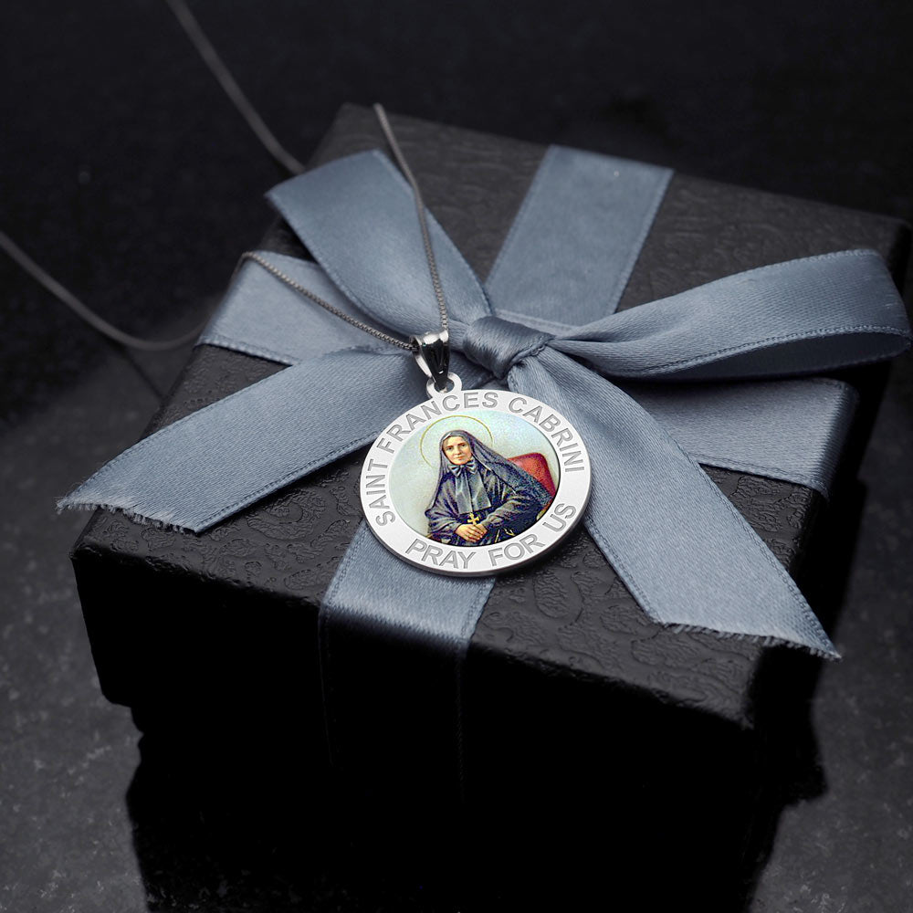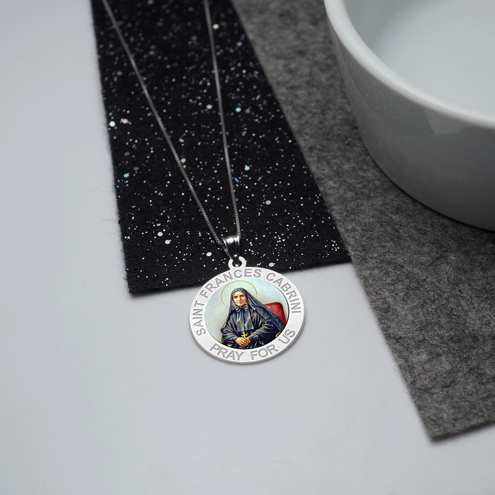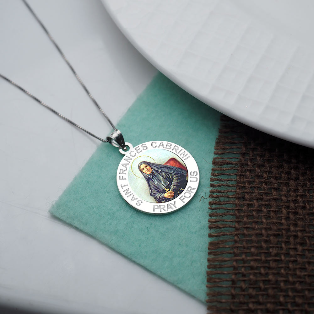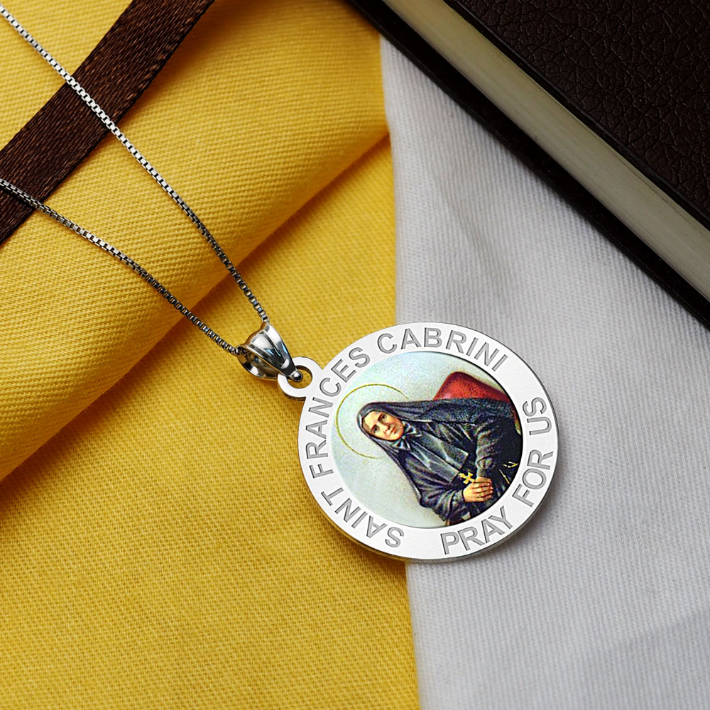 All Religious Medals are Customizable. We can change the spelling, your language, names etc, ex: change "Pray for Us" to "Pray For Me". Just let us know in "special instructions"Color Laser is a patent pending process, color is guaranteed to last foreverColor Medals can be worn in the pool, shower, etc. without affecting the image. We guarantee it.Saint Frances Xavier Cabrini (July 15, 1850 December 22, 1917) known during her life as Mother Cabrini, was the first American citizen to be canonized by the Roman Catholic Church. She is the Patron saint for Immigrants and Hospital Administrators.