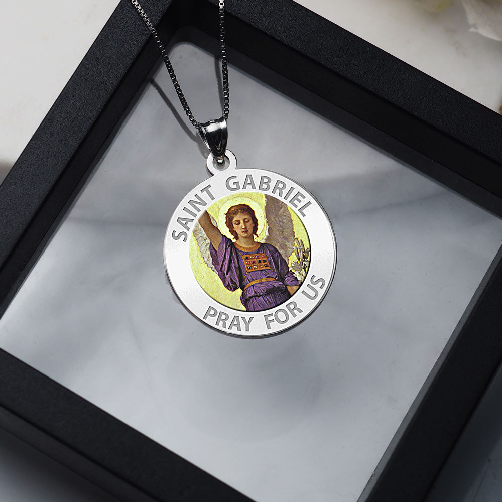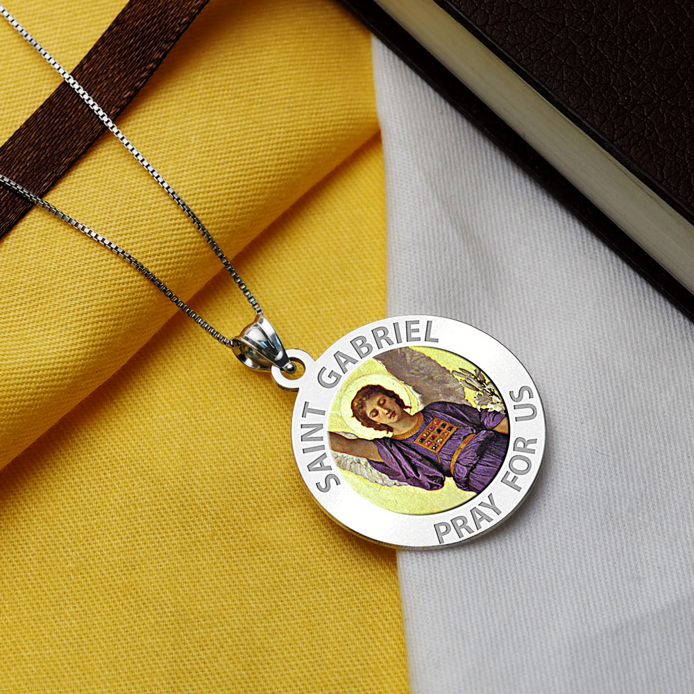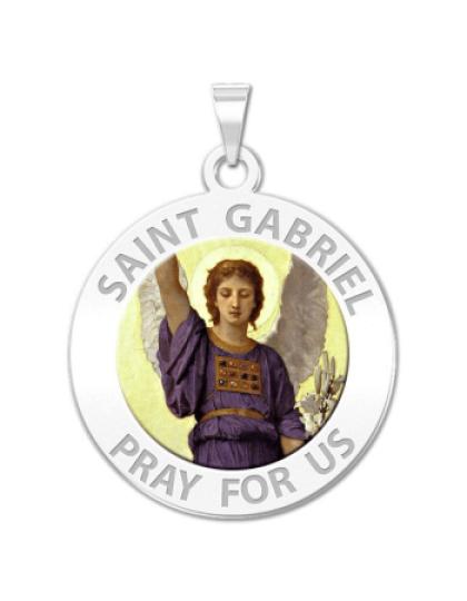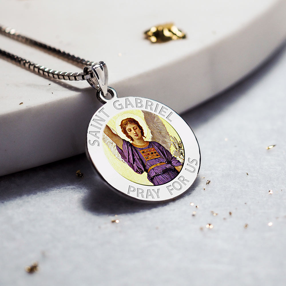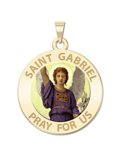 All Religious Medals are Customizable. We can change the spelling, your language, names etc, ex: change "Pray for Us" to "Pray For Me". Just let us know in "special instructions"Color Laser is a patent pending process, color is guaranteed to last foreverColor Medals can be worn in the pool, shower, etc. without affecting the image. We guarantee it.In the Gospel of Luke, St. Gabriel reveals to the Jewish Pharisee and Priest Zechariah that John the Baptist will be born to Zechariah's wife Elizabeth and visits Elizabeth's cousin Mary to reveal that she will give birth to Jesus. Gabriel's visit to Mary is often called "The Annunciation", an event that is celebrated on March 25 in the Eastern Orthodox and Catholic churches. It is also commemorated as the "First Joyful Mystery" of the rosary.
