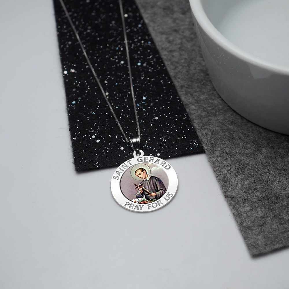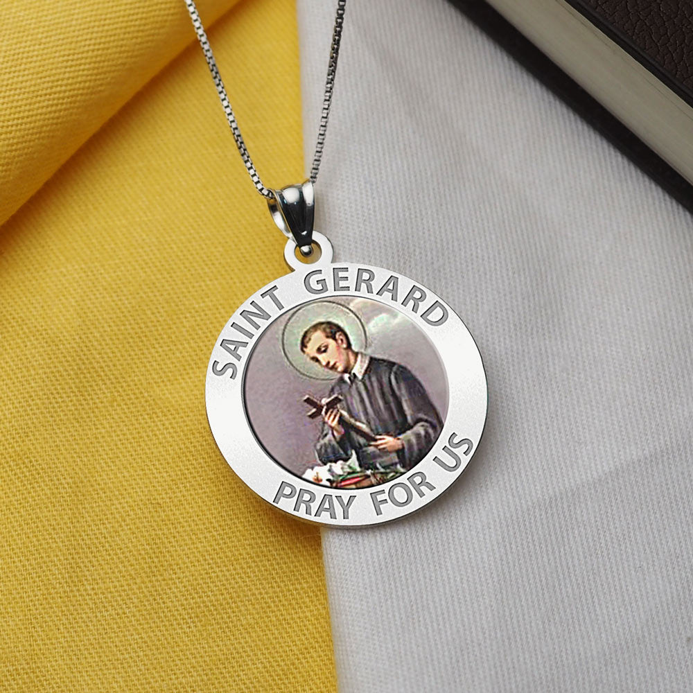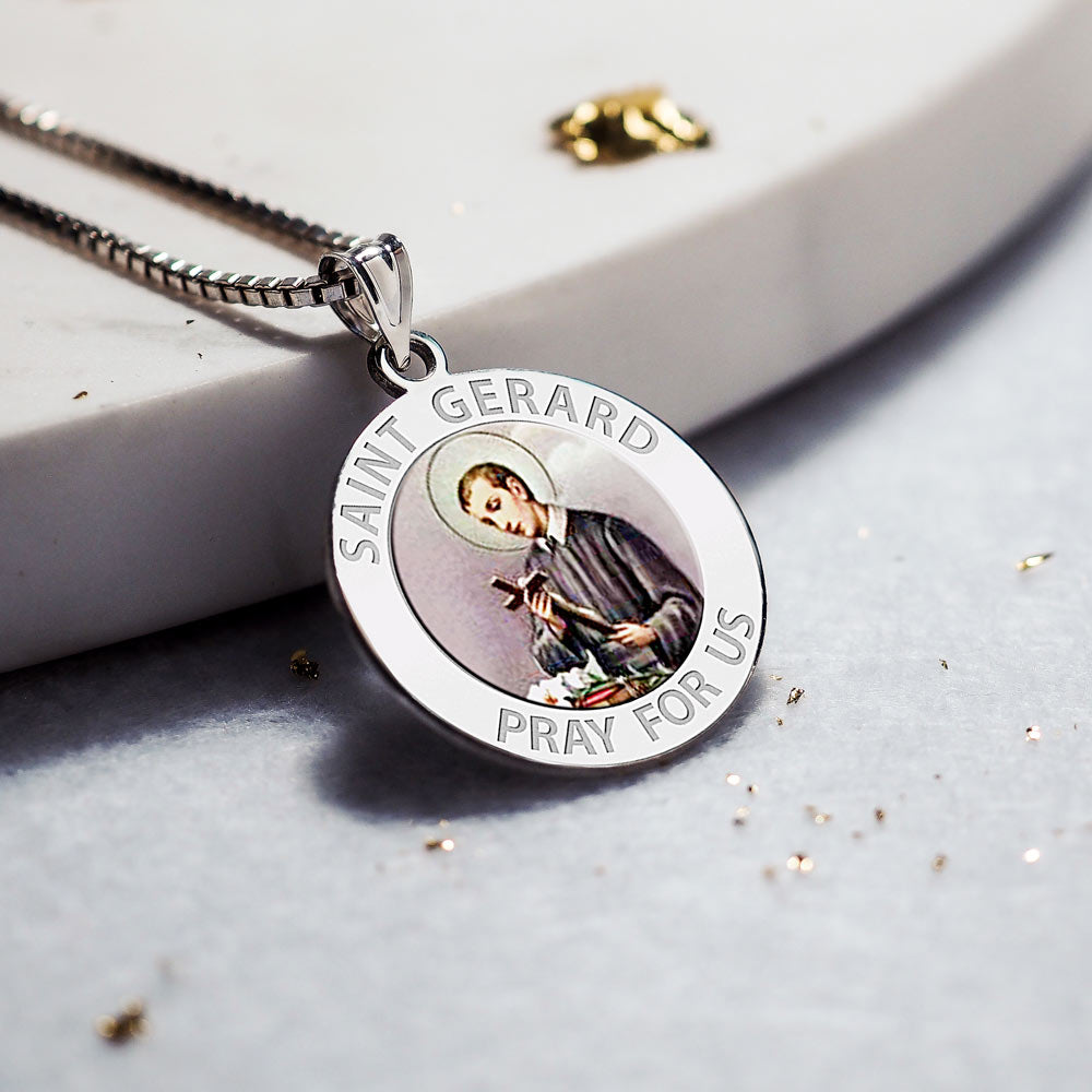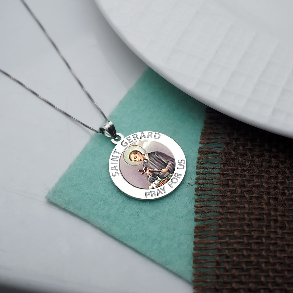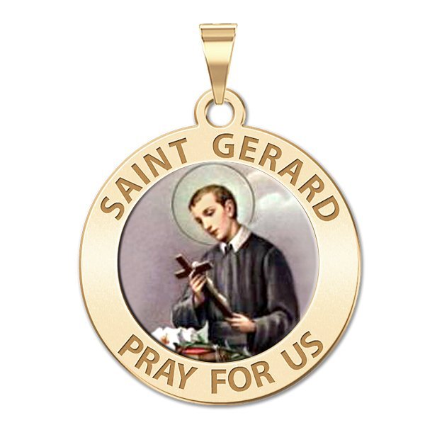 All Religious Medals are Customizable. We can change the spelling, your language, names etc, ex: change "Pray for Us" to "Pray For Me". Just let us know in "special instructions"Color Laser is a patent pending process, color is guaranteed to last foreverColor Medals can be worn in the pool, shower, etc. without affecting the image. We guarantee it.Saint Gerard Majella is a Catholic saint. He is a saint whose intercession is requested for children (and unborn children in particular); childbirth; mothers (and expectant mothers in particular); motherhood; falsely accused people; good confessions; lay brothers; and Muro Lucano, Italy. Gerard was born as Gerardo Maiella on April 6, 1726 in Muro Lucano, Italy. He was the son of a tailor who died when Gerard was 12, leaving the family in poverty. Gerard tried to join the Capuchin order, but his health prevented it. He was accepted as a Redemptorist lay brother serving his congregation as sacristan, gardener, ostiarius, infirmarian, and tailor. When falsely accused by a pregnant woman of being the father of her child, he retreated to silence; she later recanted and cleared him, and thus began his association as patron of all aspects of pregnancy. He was reputed to bilocate and read consciences. His last will consisted of the following small note on the door of his cell: "Here the will of God is done, as God wills, and as long as God wills." Gerard died on October 16, 1755 at Caposele, Italy of tuberculosis. He was aged 29. St. Gerard Majella Annual Novena takes place every year in St. Josephs Church, Dundalk, Ireland. This annual nine day novena is the biggest festival of faith in Ireland.