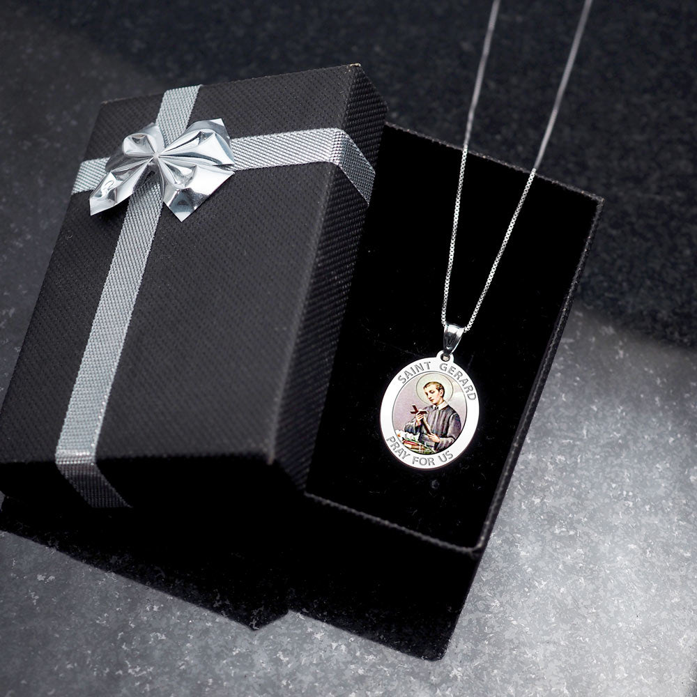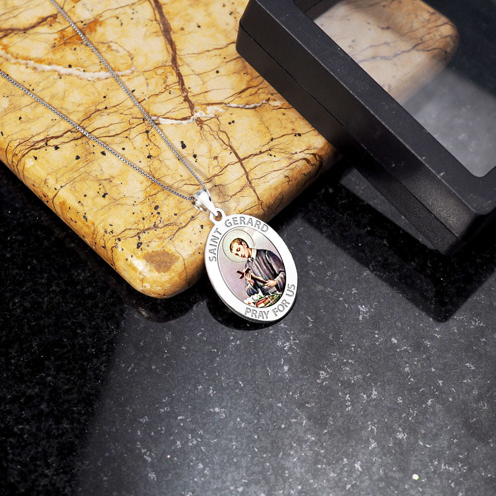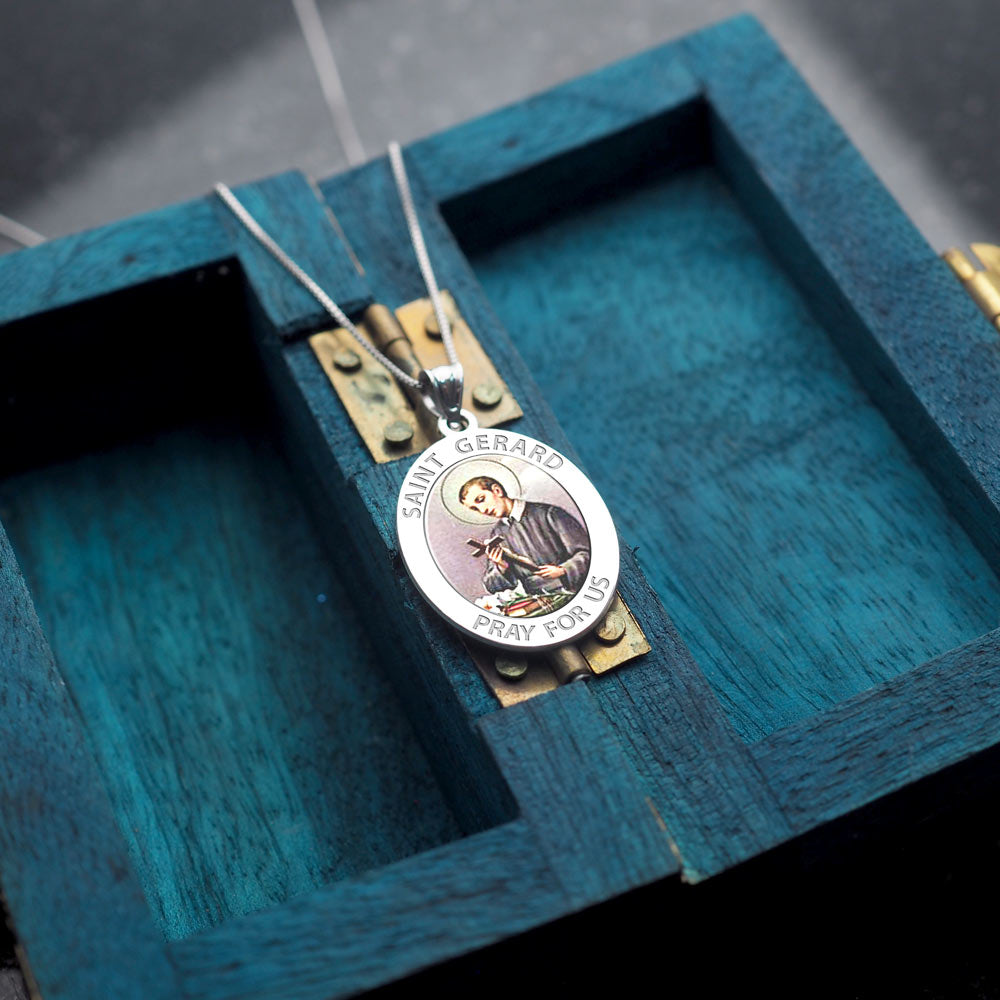 All Religious Medals are Customizable. We can change the spelling, your language, names etc, ex: change "Pray for Us" to "Pray For Me". Just let us know in "special instructions"Color Laser is a patent pending process, color is guaranteed to last foreverColor Medals can be worn in the pool, shower, etc. without affecting the image. We guarantee it.Saint Gerard Majella is a Catholic saint. He is a saint whose intercession is requested for children (and unborn children in particular); childbirth; mothers (and expectant mothers in particular); motherhood; falsely accused people; good confessions; lay brothers; and Muro Lucano, Italy. Gerard was born as Gerardo Maiella on April 6, 1726 in Muro Lucano, Italy. He was the son of a tailor who died when Gerard was 12, leaving the family in poverty. Gerard tried to join the Capuchin order, but his health prevented it. He was accepted as a Redemptorist lay brother serving his congregation as sacristan, gardener, ostiarius, infirmarian, and tailor. When falsely accused by a pregnant woman of being the father of her child, he retreated to silence; she later recanted and cleared him, and thus began his association as patron of all aspects of pregnancy. He was reputed to bilocate and read consciences. His last will consisted of the following small note on the door of his cell: "Here the will of God is done, as God wills, and as long as God wills." Gerard died on October 16, 1755 at Caposele, Italy of tuberculosis. He was aged 29. St. Gerard Majella Annual Novena takes place every year in St. Josephs Church, Dundalk, Ireland. This annual nine day novena is the biggest festival of faith in Ireland.