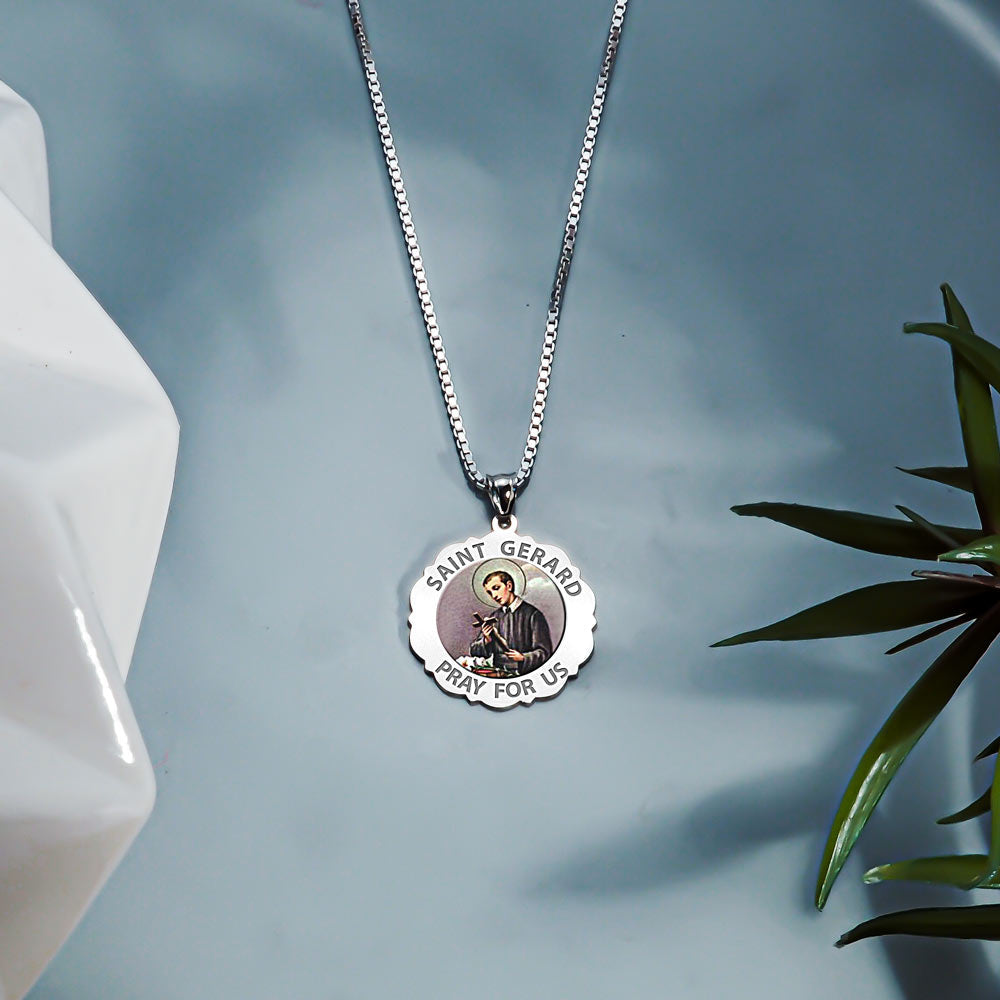 All Religious Medals are Customizable. We can change the spelling, your language, names etc, ex: change "Pray for Us" to "Pray For Me". Just let us know in "special instructions"Color Laser is a patent pending process, color is guaranteed to last foreverColor Medals can be worn in the pool, shower, etc. without affecting the image. We guarantee it.Saint Gerard Majella is a Catholic saint. He is a saint whose intercession is requested for children (and unborn children in particular); childbirth; mothers (and expectant mothers in particular); motherhood; falsely accused people; good confessions; lay brothers; and Muro Lucano, Italy. Gerard was born as Gerardo Maiella on April 6, 1726 in Muro Lucano, Italy. He was the son of a tailor who died when Gerard was 12, leaving the family in poverty. Gerard tried to join the Capuchin order, but his health prevented it. He was accepted as a Redemptorist lay brother serving his congregation as sacristan, gardener, ostiarius, infirmarian, and tailor. When falsely accused by a pregnant woman of being the father of her child, he retreated to silence; she later recanted and cleared him, and thus began his association as patron of all aspects of pregnancy. He was reputed to bilocate and read consciences. His last will consisted of the following small note on the door of his cell: "Here the will of God is done, as God wills, and as long as God wills." Gerard died on October 16, 1755 at Caposele, Italy of tuberculosis. He was aged 29. St. Gerard Majella Annual Novena takes place every year in St. Josephs Church, Dundalk, Ireland. This annual nine day novena is the biggest festival of faith in Ireland.