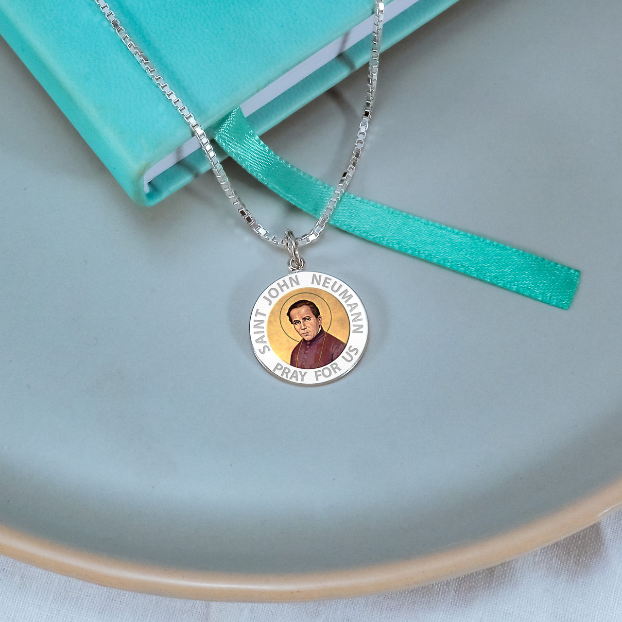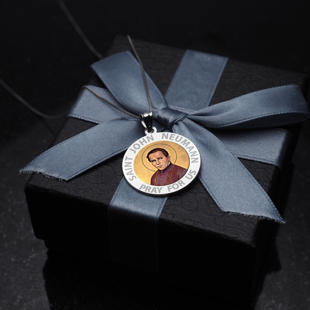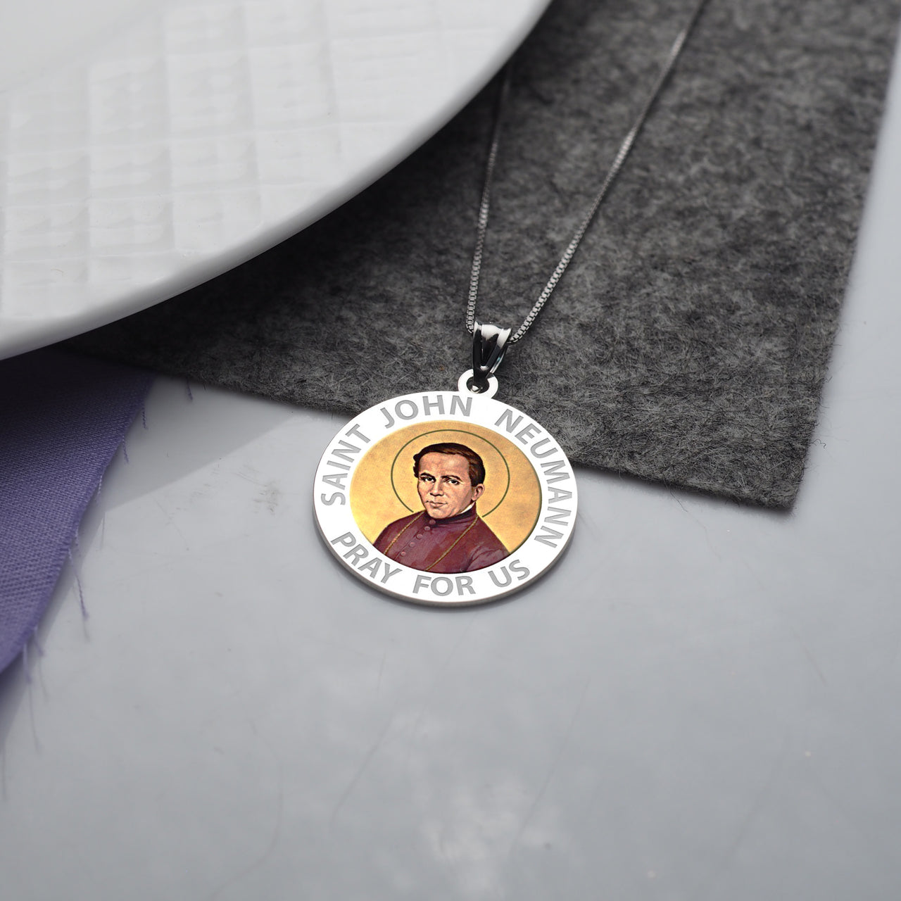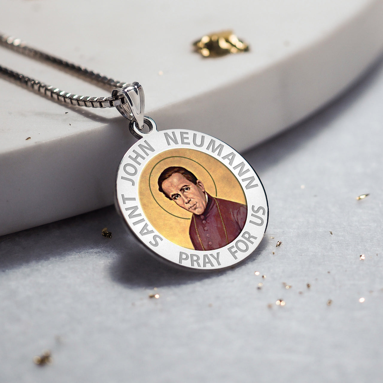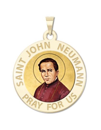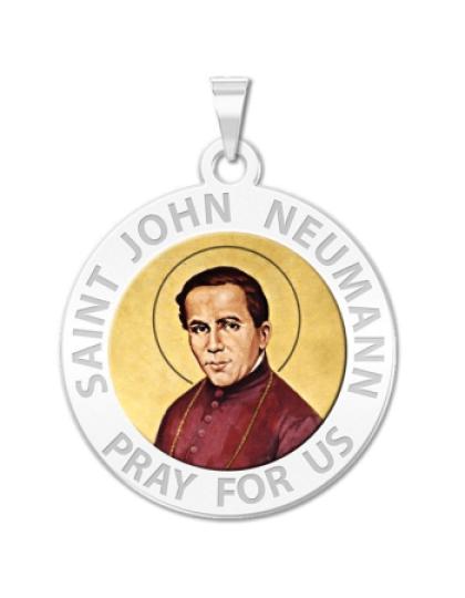All Religious Medals are Customizable. We can change the spelling, your language, names etc, ex: change "Pray for Us" to "Pray For Me". Just let us know in "special instructions"Color Laser is a patent pending process, color is guaranteed to last foreverColor Medals can be worn in the pool, shower, etc. without affecting the image. We guarantee it.Saint John Nepomucene Neumann (German: Johannes Nepomuk Neumann; Czech: Jan Nepomuck Neumann; March 28, 1811 January 5, 1860) was a Redemptorist missionary to the United States who became the fourth Bishop of Philadelphia (1852-60) and the first American bishop to be canonized. While Bishop of Philadelphia, Neumann founded the first Catholic diocesan school system in the United States. His surname is properly pronounced "Noi-mahn" as opposed to "New-man". Neumann was beatified by Pope Paul VI during the Second Vatican Council on October 13, 1963. He was canonized by Pope Paul VI on June 19, 1977. His feast day is January 5. Following his canonization, the National Shrine of St. John Neumann was constructed at the Parish of St. Peter the Apostle, which is located at the corner of 5th Street and Girard Avenue in the Northern Liberties section of Philadelphia. The remains of St. John Neumann rest under the main altar of the shrine within a glass-enclosed cavity.