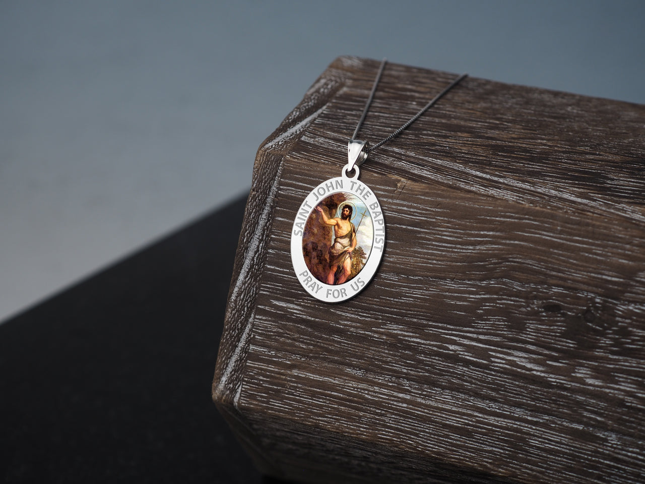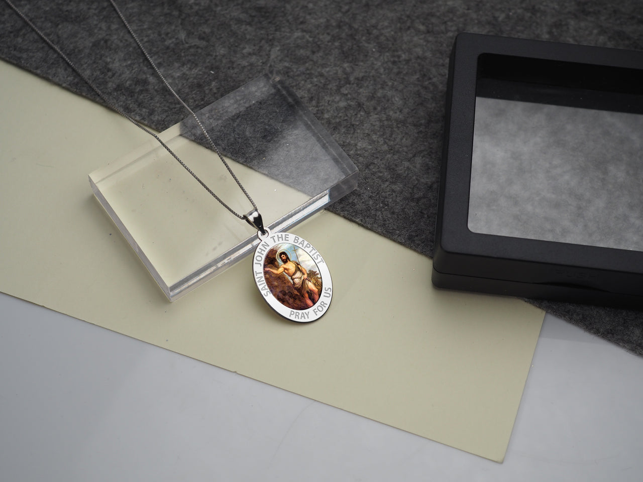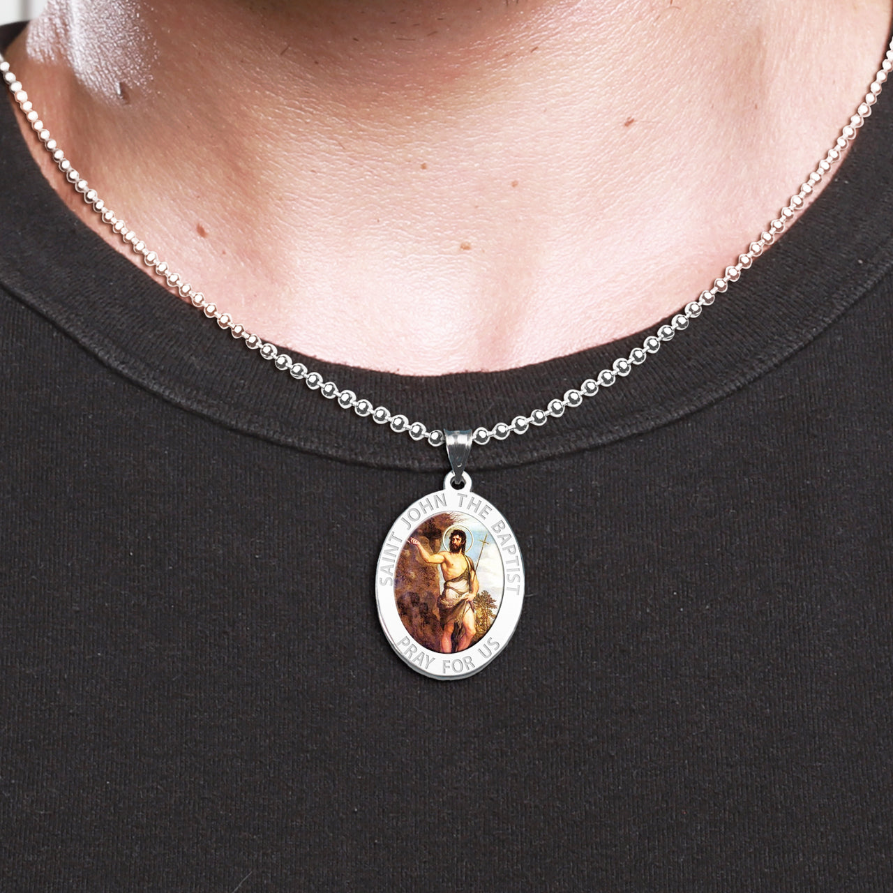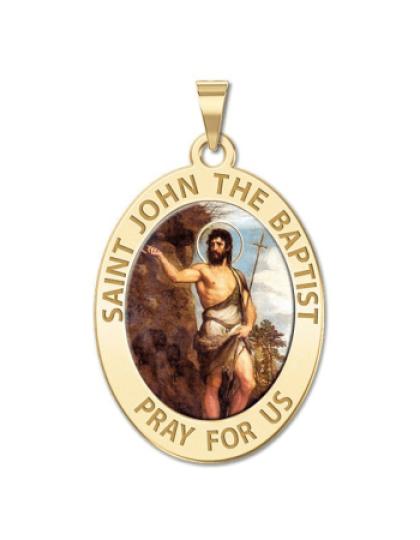 All Religious Medals are Customizable. We can change the spelling, your language, names etc, ex: change "Pray for Us" to "Pray For Me". Just let us know in "special instructions"Color Laser is a patent pending process, color is guaranteed to last foreverColor Medals can be worn in the pool, shower, etc. without affecting the image. We guarantee it.The Medal depicts St. John The Baptist baptizing Jesus, with the Holy Spirit approaching. Saint John the Baptist is the patron saint of Puerto Rico, and its capital city San Juan bears his name. In 1521, the island was given its formal name "San Juan Bautista de Puerto Rico", following the usual custom of christening the town with both its formal name and the name which Christopher Columbus had originally given the island, honoring John the Baptist. The indistinct use of "San Juan Bautista" and "Puerto Rico" for calling both the city and the island led to a reversal in practical use by most inhabitants due largely to a map-making error. Therefore by 1746 the name for the city (Puerto Rico) had become that of the entire island, while the name for the island (San Juan Bautista) had become the name for the city. The official motto for the island of Puerto Rico also references the saint, Joannes Est Nomen Eius (translated, "John is his name"). He is also a patron saint of French Canada, and Newfoundland. The Canadian cities of St. John's, Newfoundland (1497) and Saint John, New Brunswick (1604) were both named in his honor. In the UK Saint John the Baptist is the patron saint of Penzance, Cornwall. His feast day is June 24, celebrated in Quebec as the Fte nationale du Qubec (la Fte St-Jean-Baptiste).