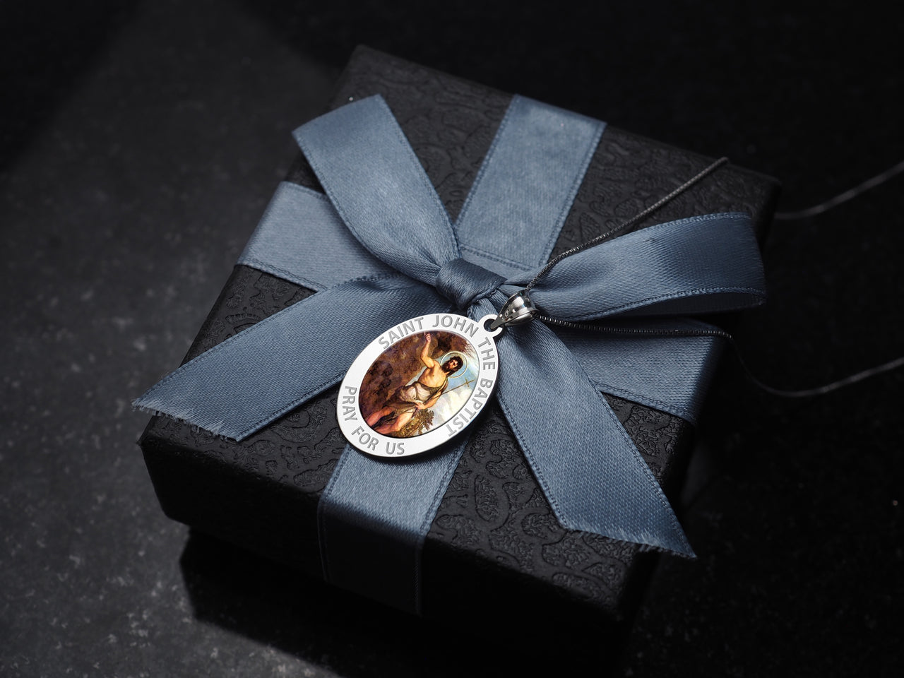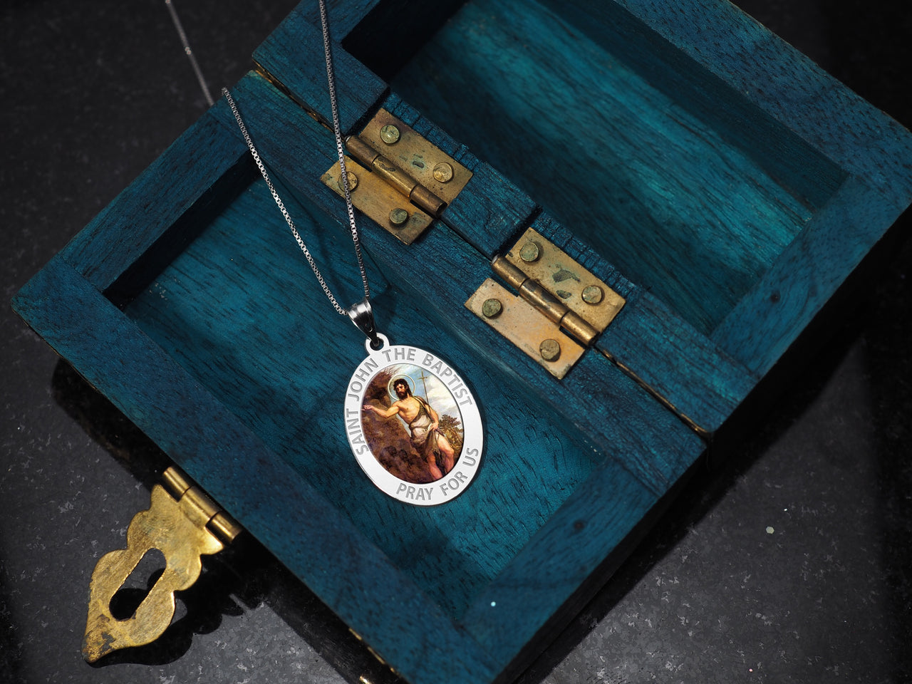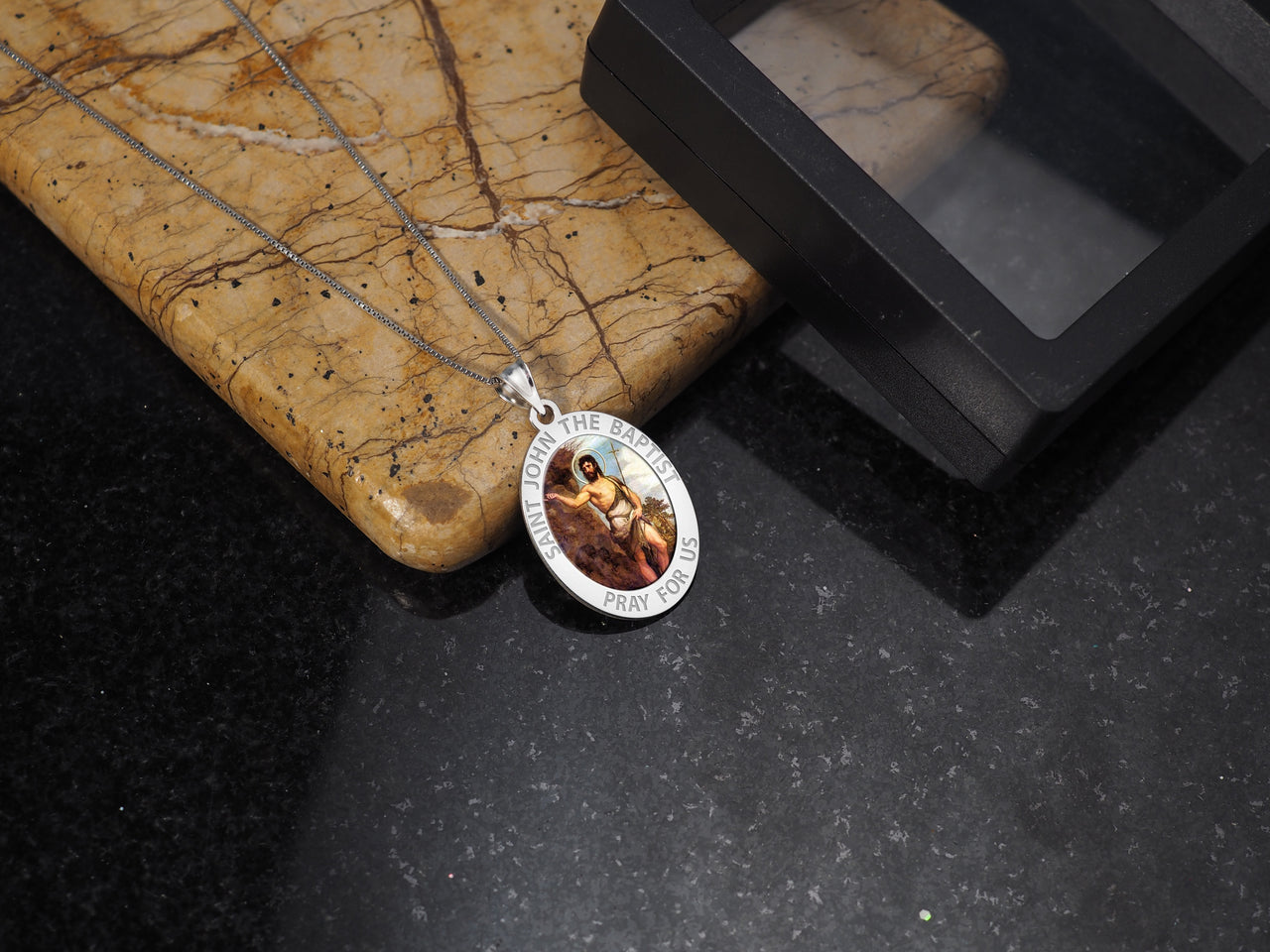 All Religious Medals are Customizable. We can change the spelling, your language, names etc, ex: change "Pray for Us" to "Pray For Me". Just let us know in "special instructions"Color Laser is a patent pending process, color is guaranteed to last foreverColor Medals can be worn in the pool, shower, etc. without affecting the image. We guarantee it.The Medal depicts St. John The Baptist baptizing Jesus, with the Holy Spirit approaching. Saint John the Baptist is the patron saint of Puerto Rico, and its capital city San Juan bears his name. In 1521, the island was given its formal name "San Juan Bautista de Puerto Rico", following the usual custom of christening the town with both its formal name and the name which Christopher Columbus had originally given the island, honoring John the Baptist. The indistinct use of "San Juan Bautista" and "Puerto Rico" for calling both the city and the island led to a reversal in practical use by most inhabitants due largely to a map-making error. Therefore by 1746 the name for the city (Puerto Rico) had become that of the entire island, while the name for the island (San Juan Bautista) had become the name for the city. The official motto for the island of Puerto Rico also references the saint, Joannes Est Nomen Eius (translated, "John is his name"). He is also a patron saint of French Canada, and Newfoundland. The Canadian cities of St. John's, Newfoundland (1497) and Saint John, New Brunswick (1604) were both named in his honor. In the UK Saint John the Baptist is the patron saint of Penzance, Cornwall. His feast day is June 24, celebrated in Quebec as the Fte nationale du Qubec (la Fte St-Jean-Baptiste).