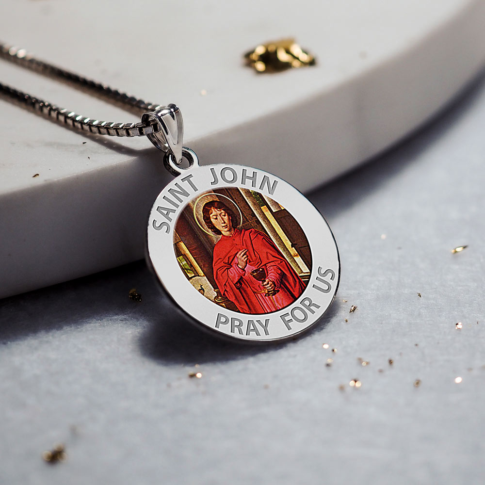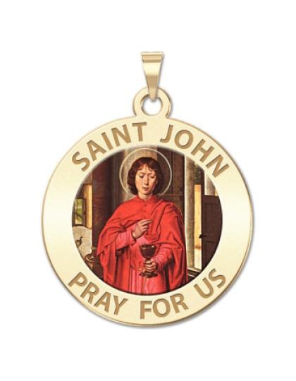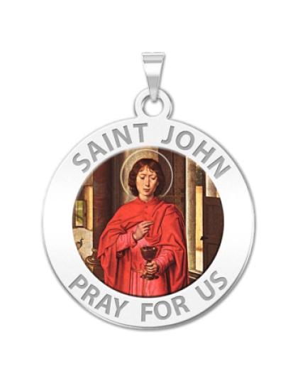 All Religious Medals are Customizable. We can change the spelling, your language, names etc, ex: change "Pray for Us" to "Pray For Me". Just let us know in "special instructions"Color Laser is a patent pending process, color is guaranteed to last foreverColor Medals can be worn in the pool, shower, etc. without affecting the image. We guarantee it.John the Apostle was one of the Twelve Apostles of Jesus. Christian tradition identifies him with the authors of several New Testament works, including the Gospel of John. Some modern scholars distinguish at least three different authors. The creator of the Gospel of John and the First Epistle of John is known as John the Evangelist, John the Theologian or John the Divine. John is traditionally held to be the author of five books of the New Testament, including the Gospel of John. However, almost all modern critical scholars place the writing of the final edition of John at some time in the late first or early second century. See Authorship of the Johannine works. Catholic/Orthodox tradition says that he and the Virgin Mary moved to Ephesus, where both eventually died. Many Evangelical and other scholars question this, especially due to the advanced age which Mary would have reached by this time. Some believe, however, that there is support for the idea that John did go to Ephesus and from there wrote the three epistles traditionally attributed to him. John was allegedly banished by the Roman authorities to the Greek island of Patmos, where some believe that he wrote the Book of Revelation. According to Tertullian (in The Prescription of Heretics) John was banished (presumably to Patmos) after being plunged into boiling oil in Rome and suffering nothing from it. It is said that the entire colosseum were converted to Christianity upon witnessing this miracle.