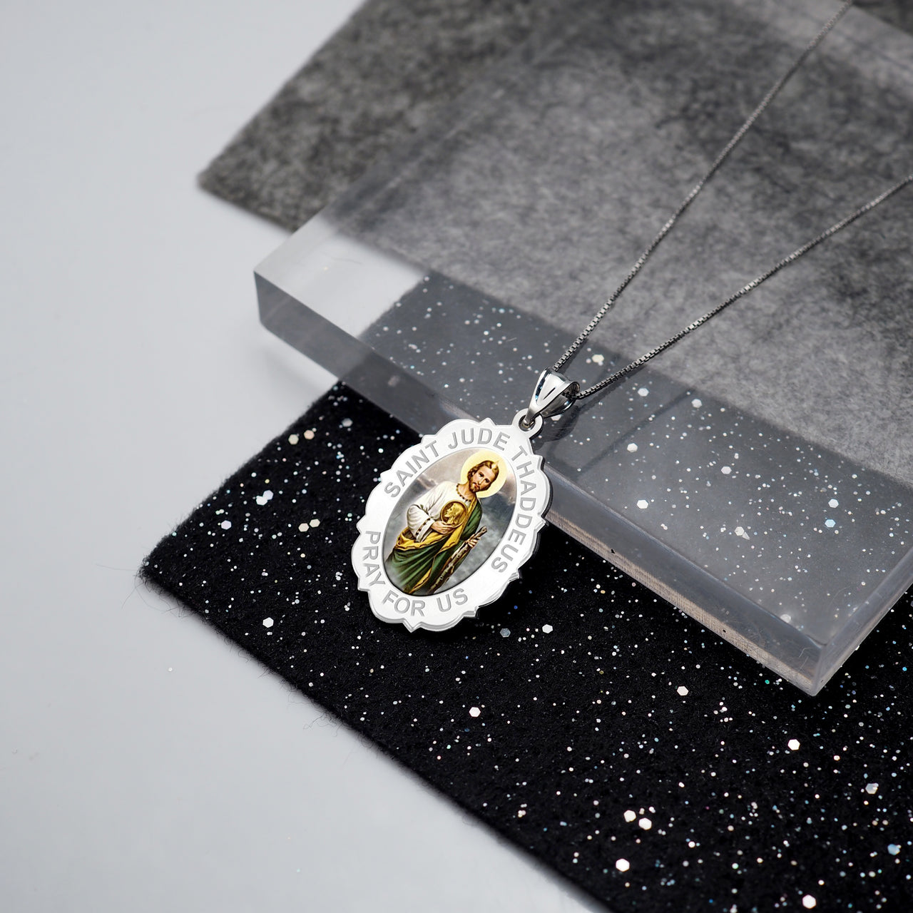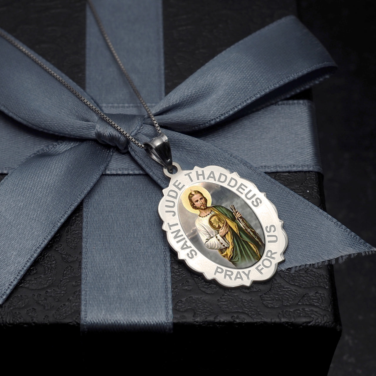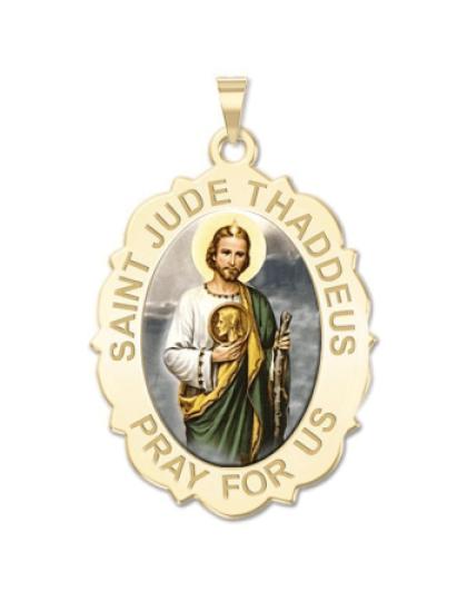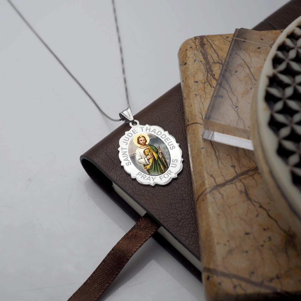 All Religious Medals are Customizable. We can change the spelling, your language, names etc, ex: change "Pray for Us" to "Pray For Me". Just let us know in "special instructions"Color Laser is a patent pending process, color is guaranteed to last foreverColor Medals can be worn in the pool, shower, etc. without affecting the image. We guarantee it.Saint Jude, one of twelve apostles, known as the Saint of impossible. People in desperate circumstances will ask St. Jude to intercede with God to obtain help with their problems.