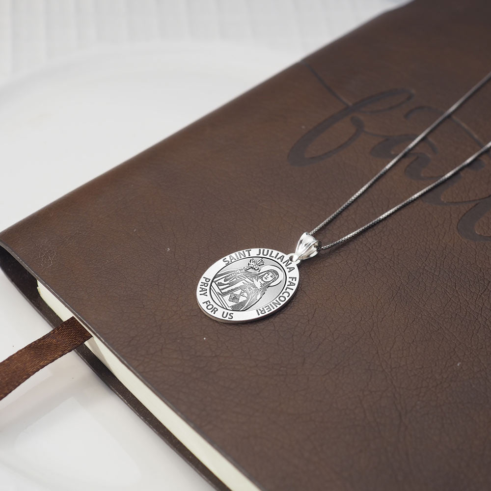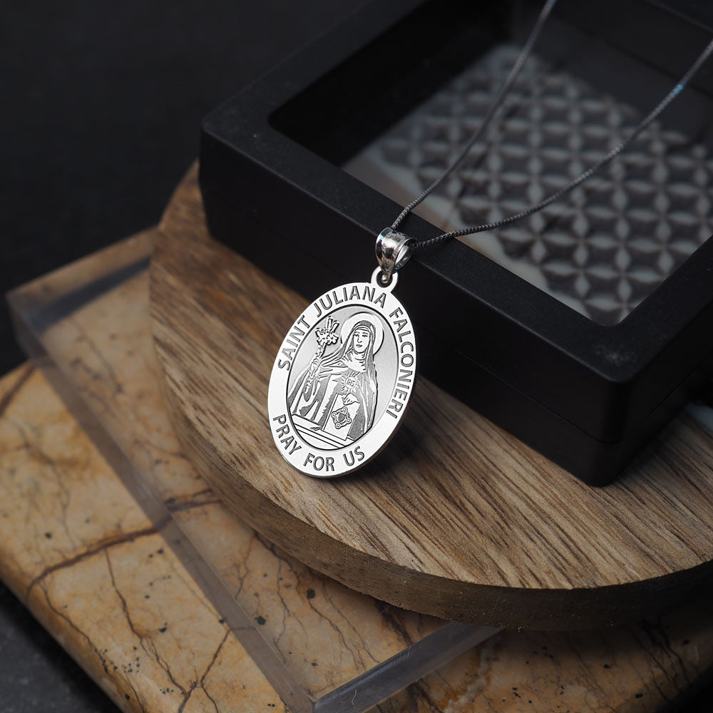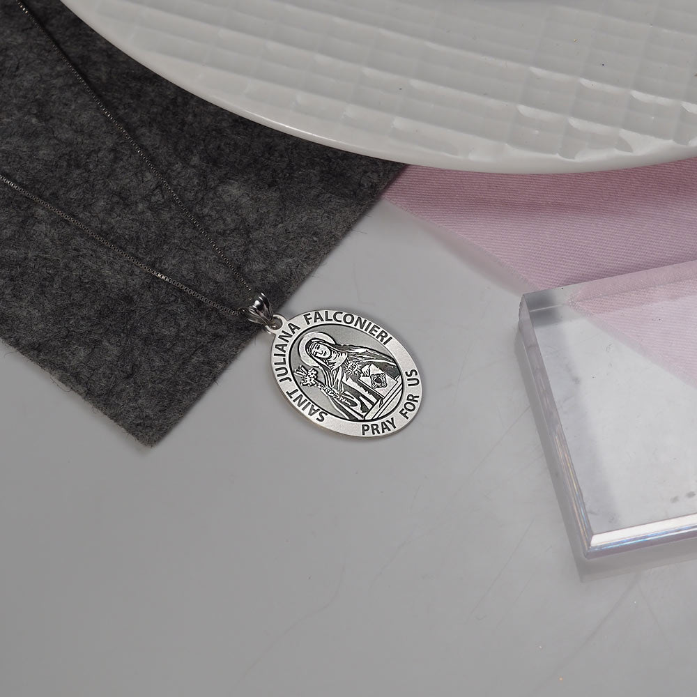 All Religious Medals are Customizable. We can change the spelling, your language, names etc, ex: change "Pray for Us" to "Pray For Me". Just let us know in "special instructions"Saint Juliana Falconieri (1270 June 19, 1341) was the Italian foundress of the Sisters of the Third Order of Servites (or the Servite Tertiaries). Juliana belonged to the noble Florentine family of the Falconieri. Her uncle, Alexis Falconieri, was one of the seven founders of the Servite Order. Under his influence, she decided at a young age to follow the religious life. After her father's death, she received c. 1385 the habit of the Third Order of the Servites, from Philip Benizi (Benitius), then General of that order. She remained at home following the rule Benizi had given her until her mother's death, when Juliana and several companions moved into a house of their own in 1305. This became the first convent of the Sisters of the Third Order of Servites. Juliana would serve as superior until the end of her life. The Servites' dress consisted of a black gown, secured by a leather girdle, and a white veil. Because the gown had short sleeves to facilitate work, people called the sisters of the new order "Mantellate." The sisters devoted themselves especially to the care of the sick and other works of mercy. Juliana directed the community of Servite Tertiaries for thirty-five years. An extraordinary occurrence, mentioned in the oratio of her feast day, is said to have occurred at Juliana's death. She, at this time, unable to receive Holy Communion because of constant vomiting, requested the priest to spread a corporal upon her chest and lay the Host on it. Shortly thereafter, the Host disappeared and Juliana died, June 19, 1341.[1] The image of a Cross, just like the one on the Host, was found on her breast.
