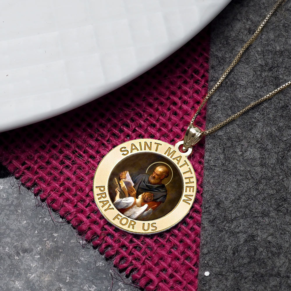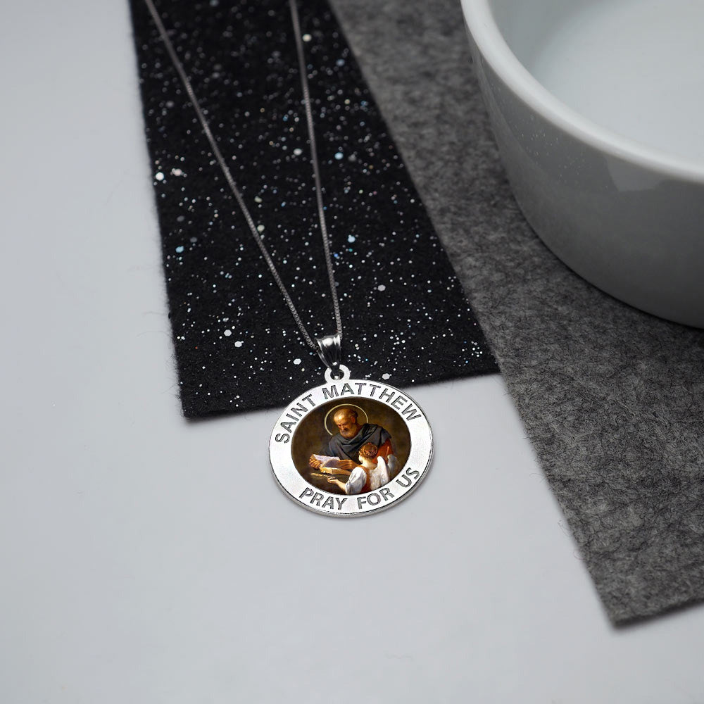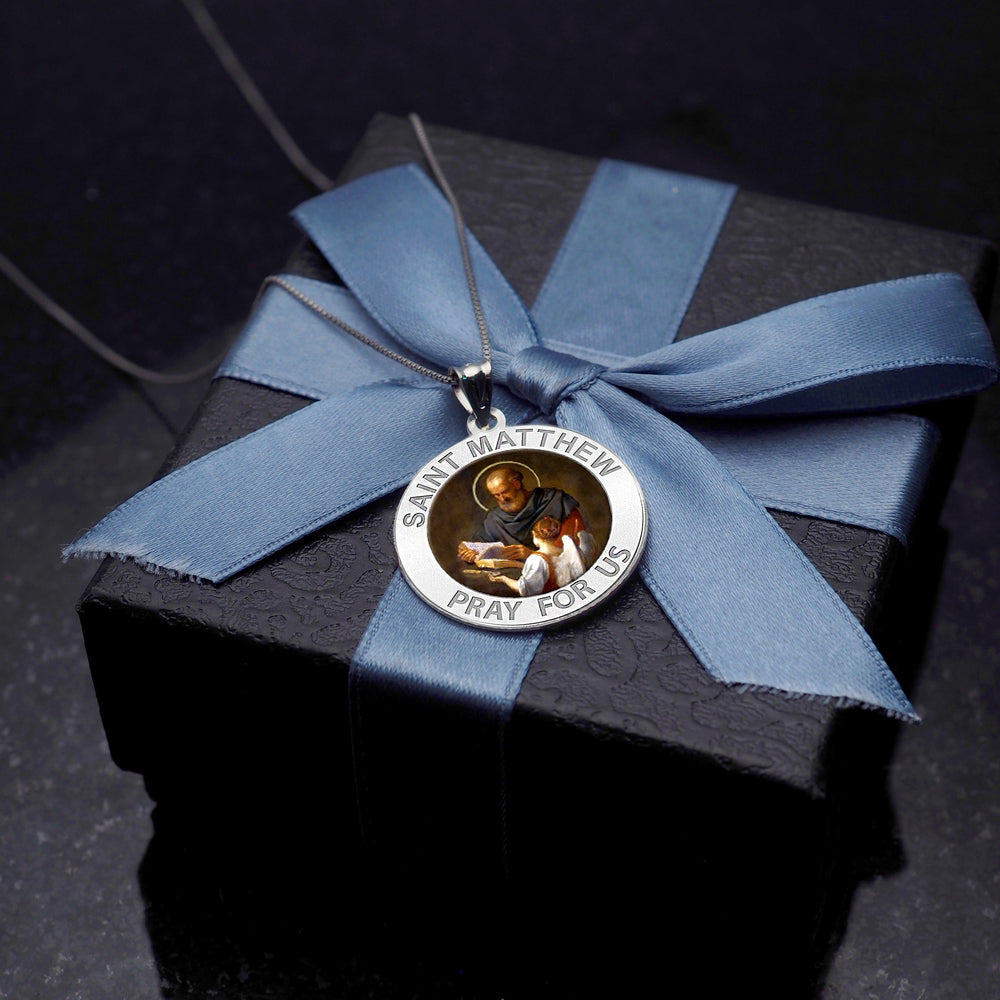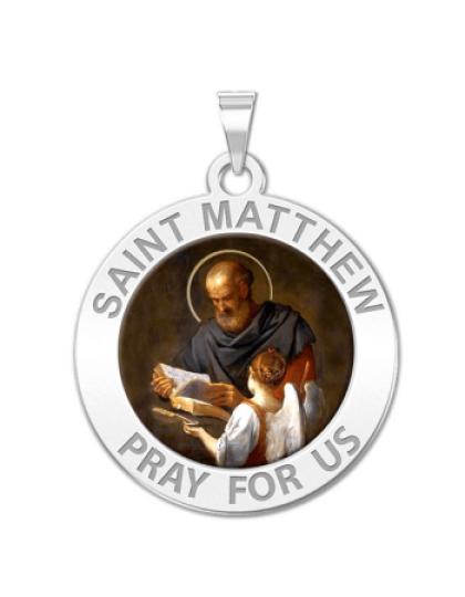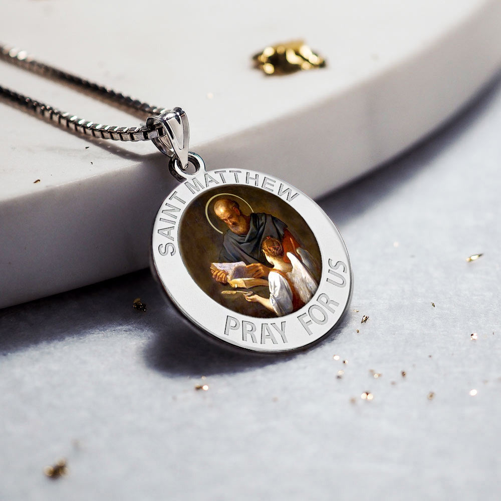 All Religious Medals are Customizable. We can change the spelling, your language, names etc, ex: change "Pray for Us" to "Pray For Me". Just let us know in "special instructions"Color Laser is a patent pending process, color is guaranteed to last foreverColor Medals can be worn in the pool, shower, etc. without affecting the image. We guarantee it.Saint Matthew, is a Christian figure, and one of Jesus's Twelve Apostles. He is credited by tradition with writing the Gospel of Matthew, and is identified in that gospel as being the same person as Levi the toll collector. He is the patron saint for Accountants.