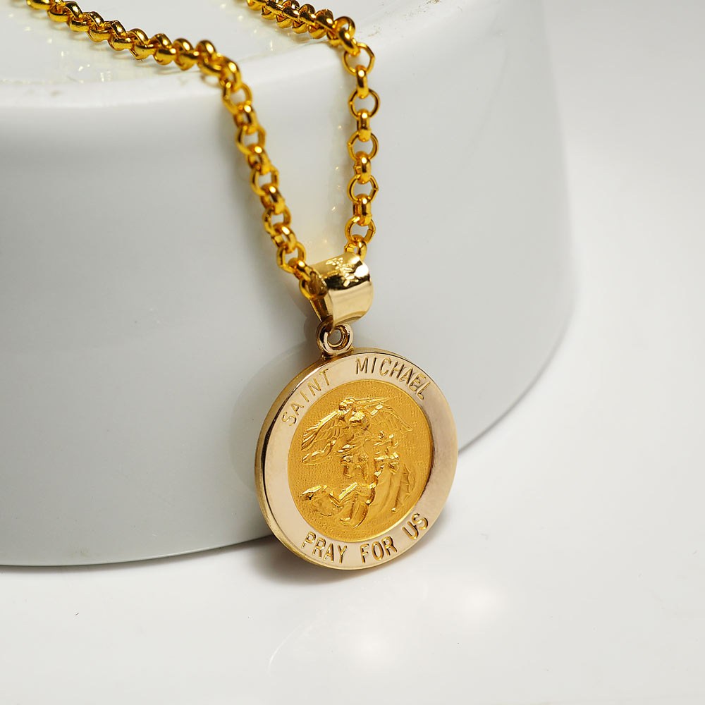- St. Michael is the patron saint of grocers, mariners, paratroopers, policemen, radiologists, the sick and Germany. This Solid 14K Gold Saint Michael medal is the patron Saint of Policemen. His name is Hebrew for "who is like God?" He is represented in the act of defeating the devil.