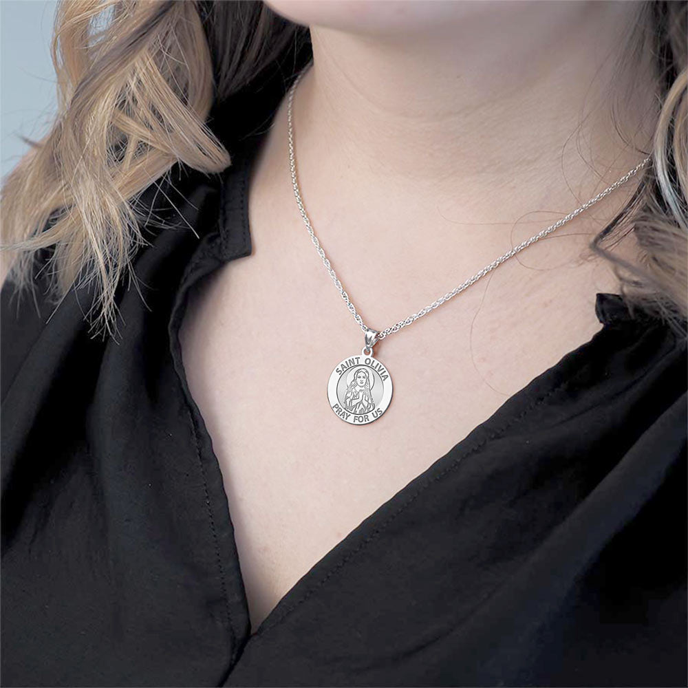 All Religious Medals are Customizable. We can change the spelling, your language, names etc, ex: change "Pray for Us" to "Pray For Me". Just let us know in "special instructions"Saint Olivia, according to legend, was the beautiful daughter of a noble Sicilian family. She is supposed to have lived in the 9th century. When she was 13 years old she was kidnapped by Muslims and taken as a slave to Tunis. Impressed by her virtue and beauty her abductors permitted her to live as a hermitess in a cave. However, after she begun to perform miracle cures on the local sick, many Muslims converted to Christianity. Consequently she was imprisoned and tortured. She was sentenced to be burnt to death, but the flames would not touch her. The Muslims then decapitated her, which finally killed her.
