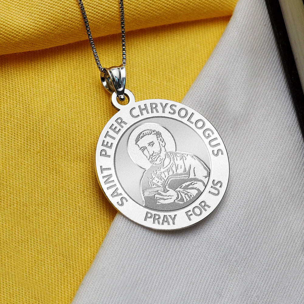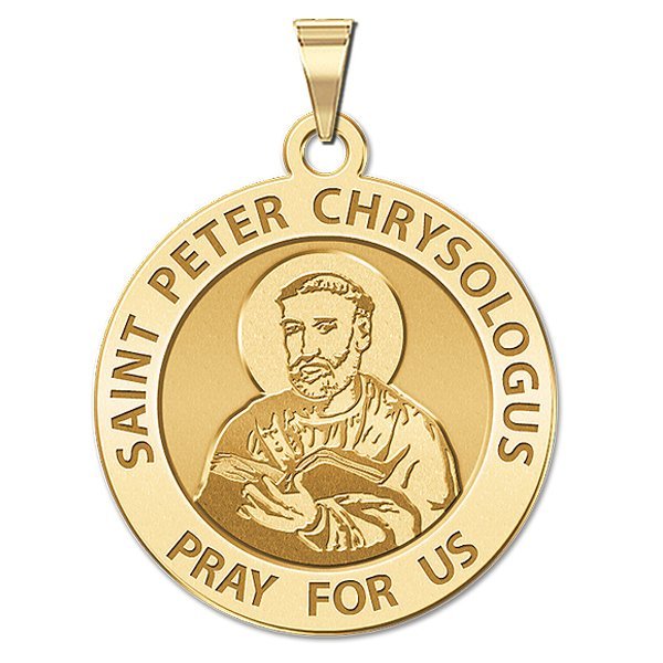 All Religious Medals are Customizable. We can change the spelling, your language, names etc, ex: change "Pray for Us" to "Pray For Me". Just let us know in "special instructions"Peter was born in Imola, where he was ordained a deacon by Cornelius, Bishop of Imola. He was made an archdeacon through the influence of Emperor Valentinian III. Pope Sixtus III appointed Peter to the See of Ravenna in about the year 433, apparently rejecting the candidate elected by the people of the city. The traditional account, as recorded in the Roman Breviary, is that Sixtus had a vision of St. Peter and St. Apollinaris, the first bishops of Rome and Ravenna respectivly, who showed Sixtus a young man and said he was the next Bishop of Ravenna. When the group from Ravenna arrived, including Cornelius and his archdeacon Peter from Imola, Sixtus recognized Peter as the young man in his vision and consecrated him as a bishop. Known as The Doctor of Homilies, Peter was known for his short but inspired talks; he is said to have been afraid of boring his audience. After hearing his first homily as bishop, Empress Galla Placidia is said to have given him the surname Chrysologus, by which he is known. Galla Placidia was to become the patroness of many of Peter's projects. Peter spoke against the Arian and Monophysite teachings, condemning them as heresies, and explained topics such as the Apostles' Creed, John the Baptist, the Blessed Virgin Mary, and the mystery of the Incarnation, in simple and clear language. Peter advocated daily reception of Holy Communion. He urged his listeners to have confidence in the forgiveness offered through Christ.