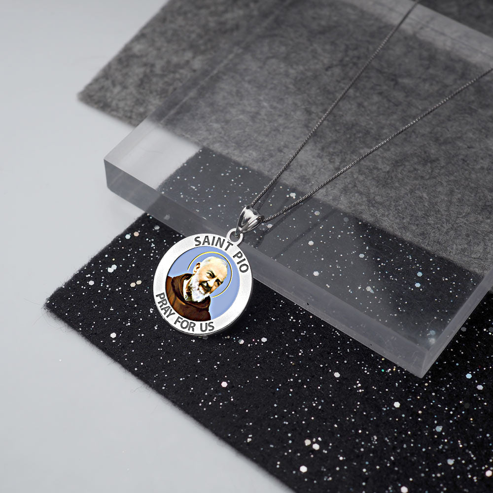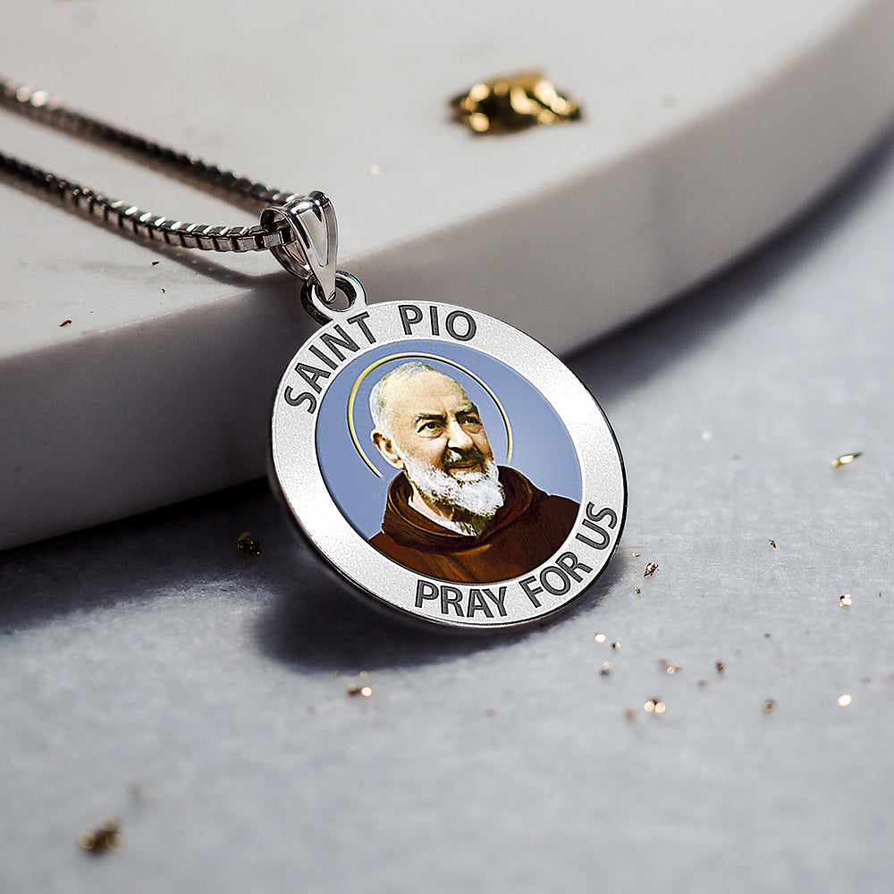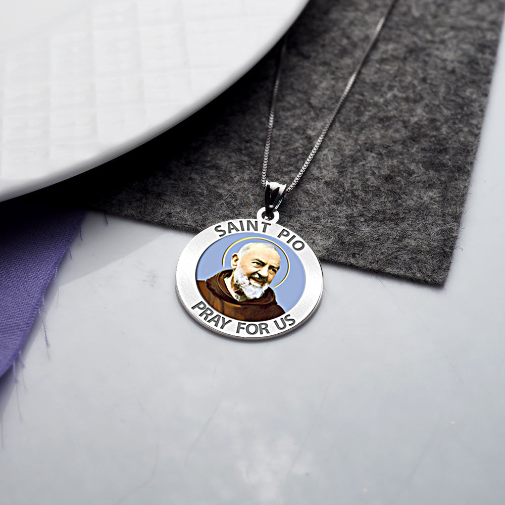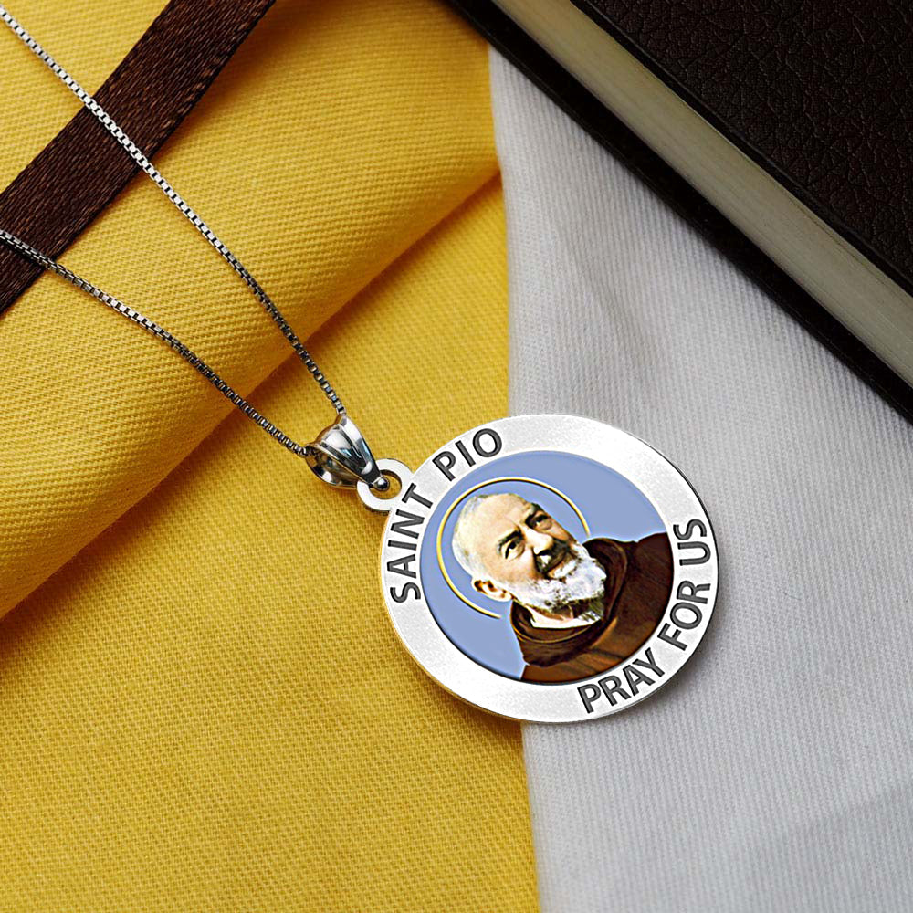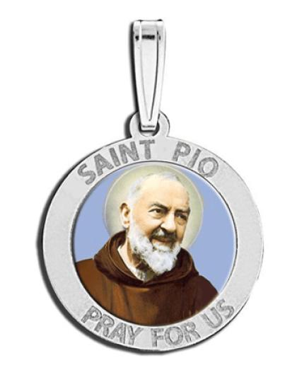 All Religious Medals are Customizable. We can change the spelling, your language, names etc, ex: change "Pray for Us" to "Pray For Me". Just let us know in "special instructions"Color Laser is a patent pending process, color is guaranteed to last foreverColor Medals can be worn in the pool, shower, etc. without affecting the image. We guarantee it.This rare and exclusive medal celebrates Padre Pio's promotion into Sainthood. Padre Pio was an Italian Roman Catholic priest who is now venerated as a saint in the Roman Catholic Church. He was given the name Pio when he joined the Order of Friars Minor Capuchin, and was popularly known as Padre Pio after his ordination to the priesthood. He became famous for his piety.
