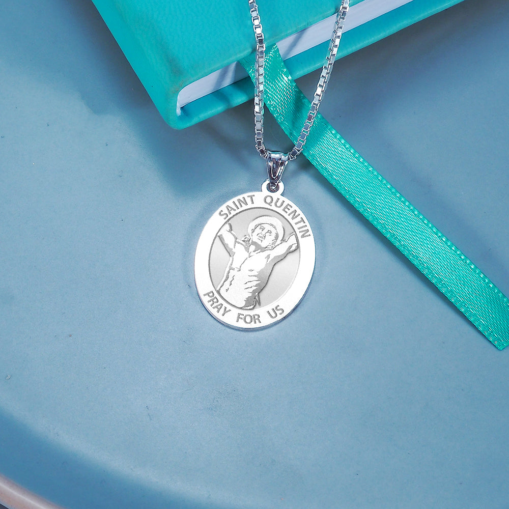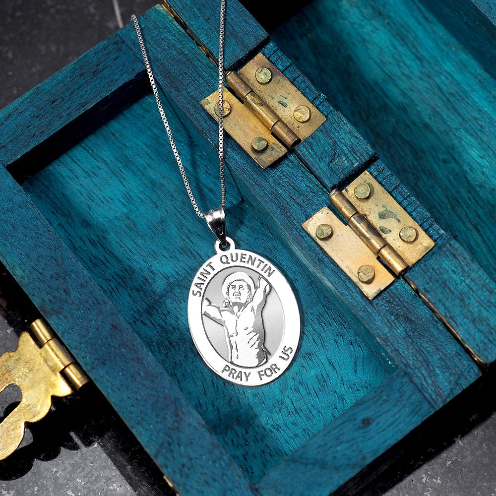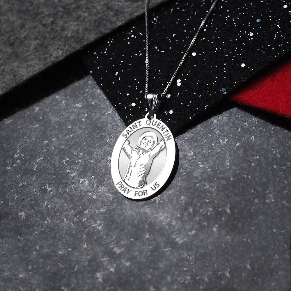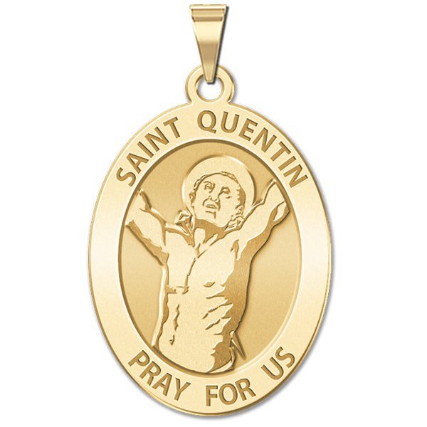 All Religious Medals are Customizable. We can change the spelling, your language, names etc, ex: change "Pray for Us" to "Pray For Me". Just let us know in "special instructions"Saint Quentin and The legend of his life has him as a Roman citizen who was martyred in Gaul. He is said to have been the son of a man named Zeno, who had senatorial rank. Filled with apostolic zeal, Quentin traveled to Gaul as a missionary with Saint Lucian, who was later martyred at Beauvais and others (the martyrs Victoricus and Fuscian are said to have been Quentin's followers). Quentin settled at Amiens and performed many miracles there. Because of his preaching, he was imprisoned by the "prefect" Rictiovarus, who had traveled to Amiens from Trier. Quentin was manacled, tortured repeatedly, but refused to abjure his faith. The prefect left Amiens to go to Reims, the capital of Gallia Belgica, where he wanted Quentin judged. But, on the way, in a town named Augusta Veromanduorum (now Saint-Quentin, Aisne), Quentin miraculously escaped and again started his preaching. Rictiovarus decided to interrupt his journey and pass sentence: Quentin was tortured again, then beheaded and thrown secretly into the marshes around the Somme, by Roman soldiers.