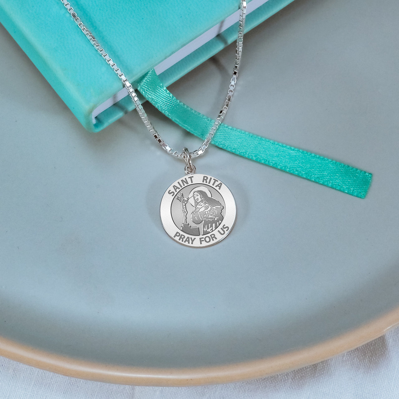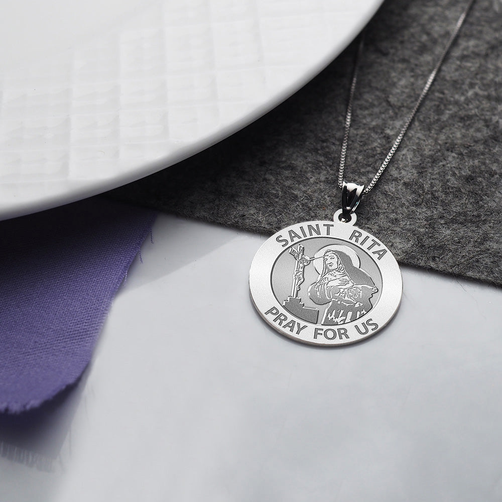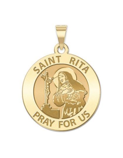 All Religious Medals are Customizable. We can change the spelling, your language, names etc, ex: change "Pray for Us" to "Pray For Me". Just let us know in "special instructions"St. Rita was born at Roccaporena near Spoleto, Umbria, Italy. She married at age 12 to Paolo Mancini. Her parents arranged her marriage, despite the fact that she repeatedly begged them to allow her to enter a convent. Mancini was a rich, quick-tempered, immoral man, who made many enemies in the region. St. Rita endured his insults, abuse, and infidelities for 18 years, and bore two sons with Mancini, Giangiacomo Antonio and Paolo Maria. Although she tried to raise them with Catholic values, her sons grew to be like their father. Toward the end of her husband's life, St. Rita helped convert him to live in a more pious manner. Although Mancini became more congenial, his allies betrayed him, and he was violently stabbed to death. Before his death, he repented to St. Rita and the Church, and she forgave him for his transgressions against her. After Mancini's murder, her sons wished to exact revenge on their father's murderers. Knowing murder was wrong, she tried to persuade them from retaliating, but to no avail. She, instead, prayed to God for Him to take away the lives of her sons instead of seeing them commit such a terrible sin. In religious history, God heard St. Rita's words and her sons died of natural causes a year later. After the deaths of her husband and sons, St. Rita desired to enter the monastery of Saint Mary Magdalene at Cascia but was spurned for being a widow, as virginity was required for entry into the convent. However, she persisted in her cause and was given a condition before the convent could accept her; the difficult task of reconciling her family with her husband's murderers. She was able to resolve the conflicts between the fami