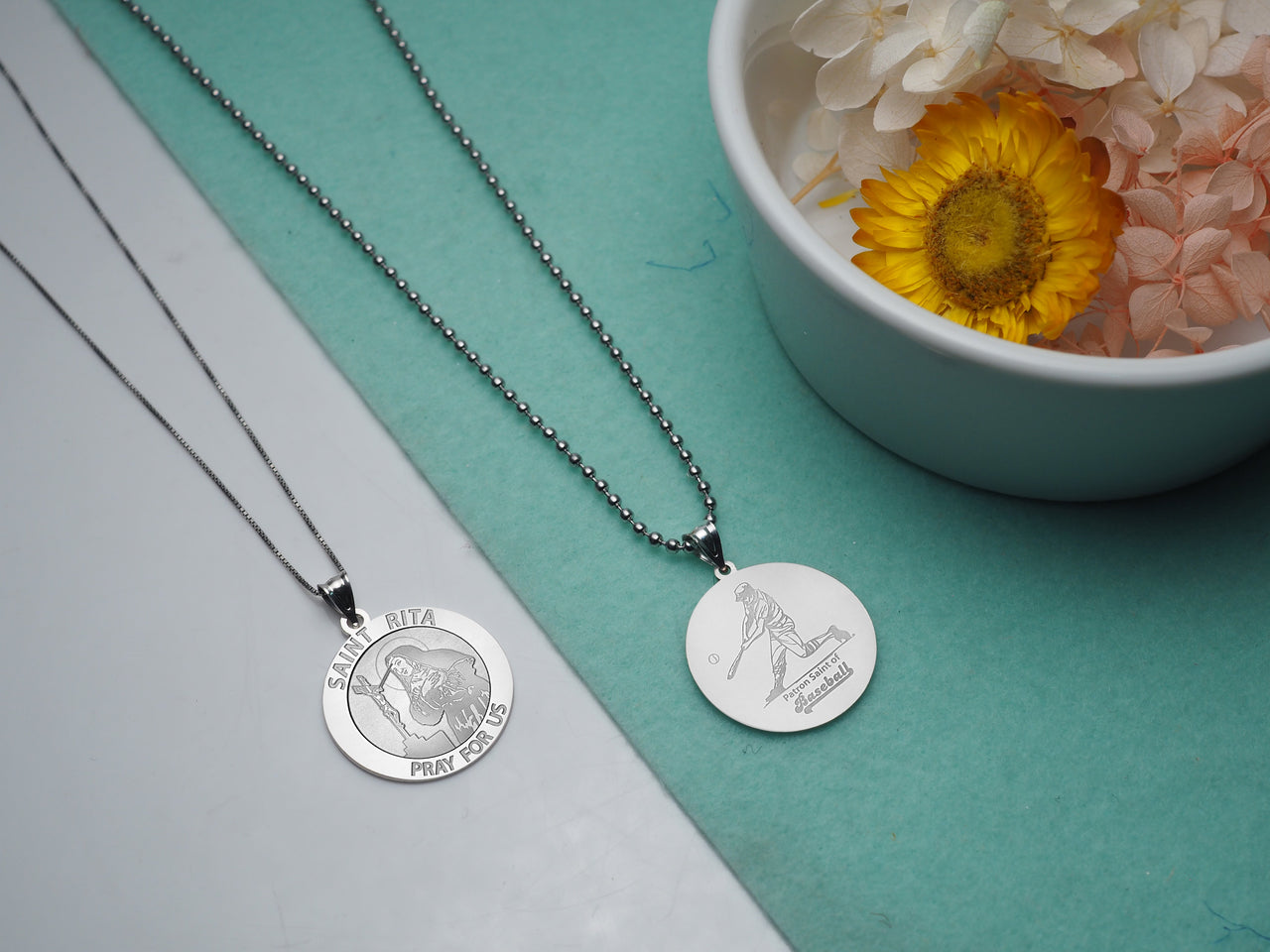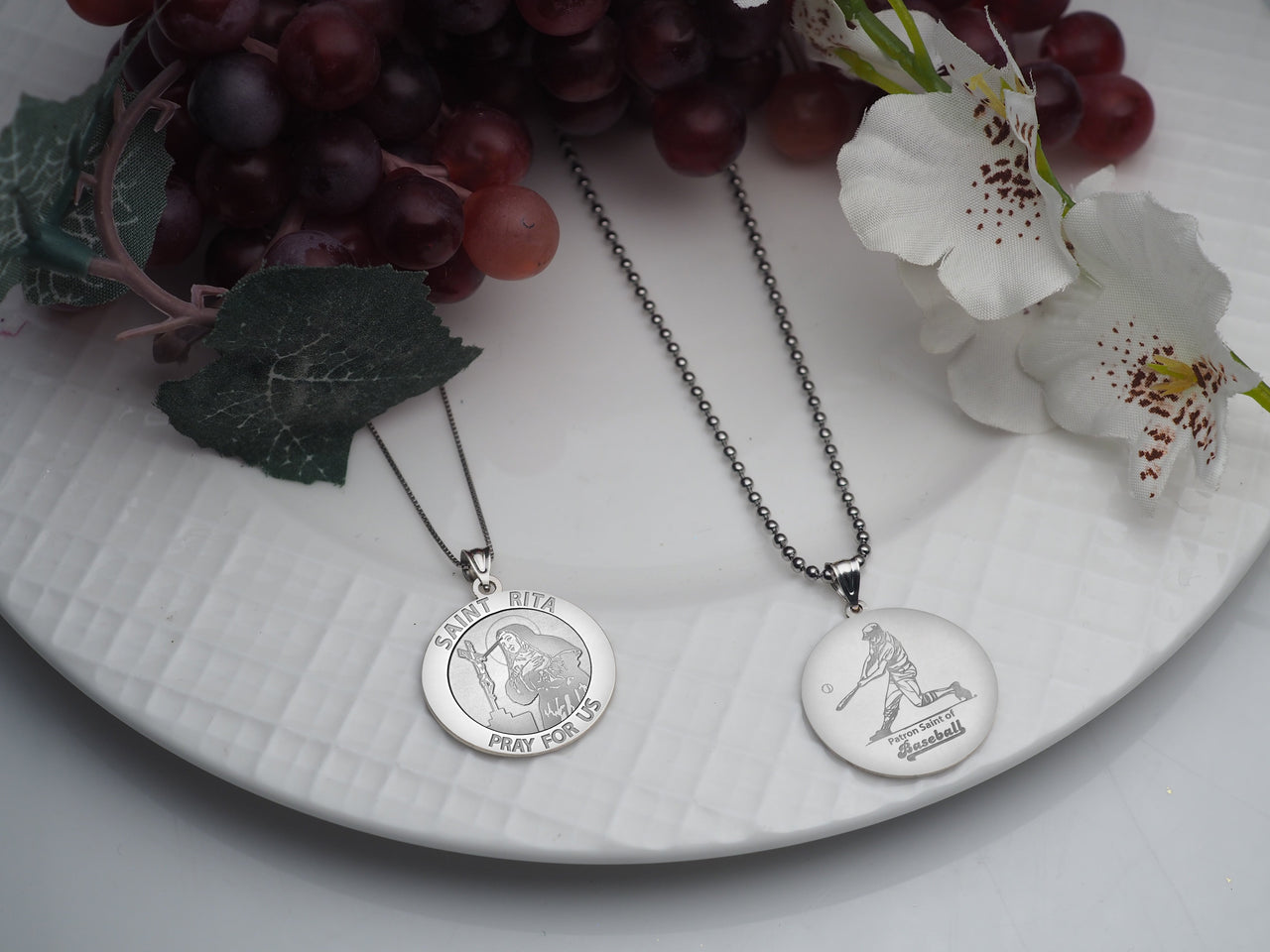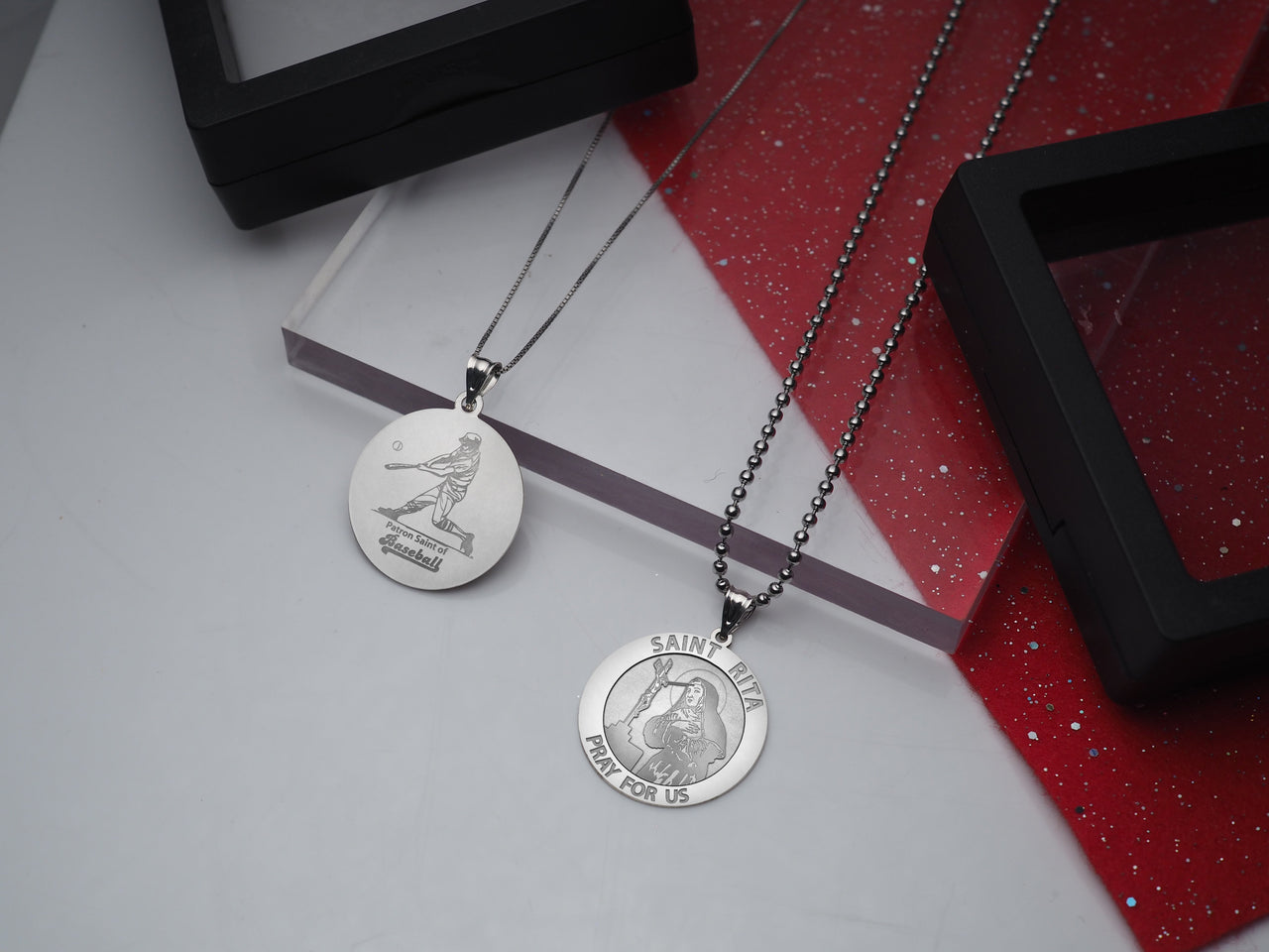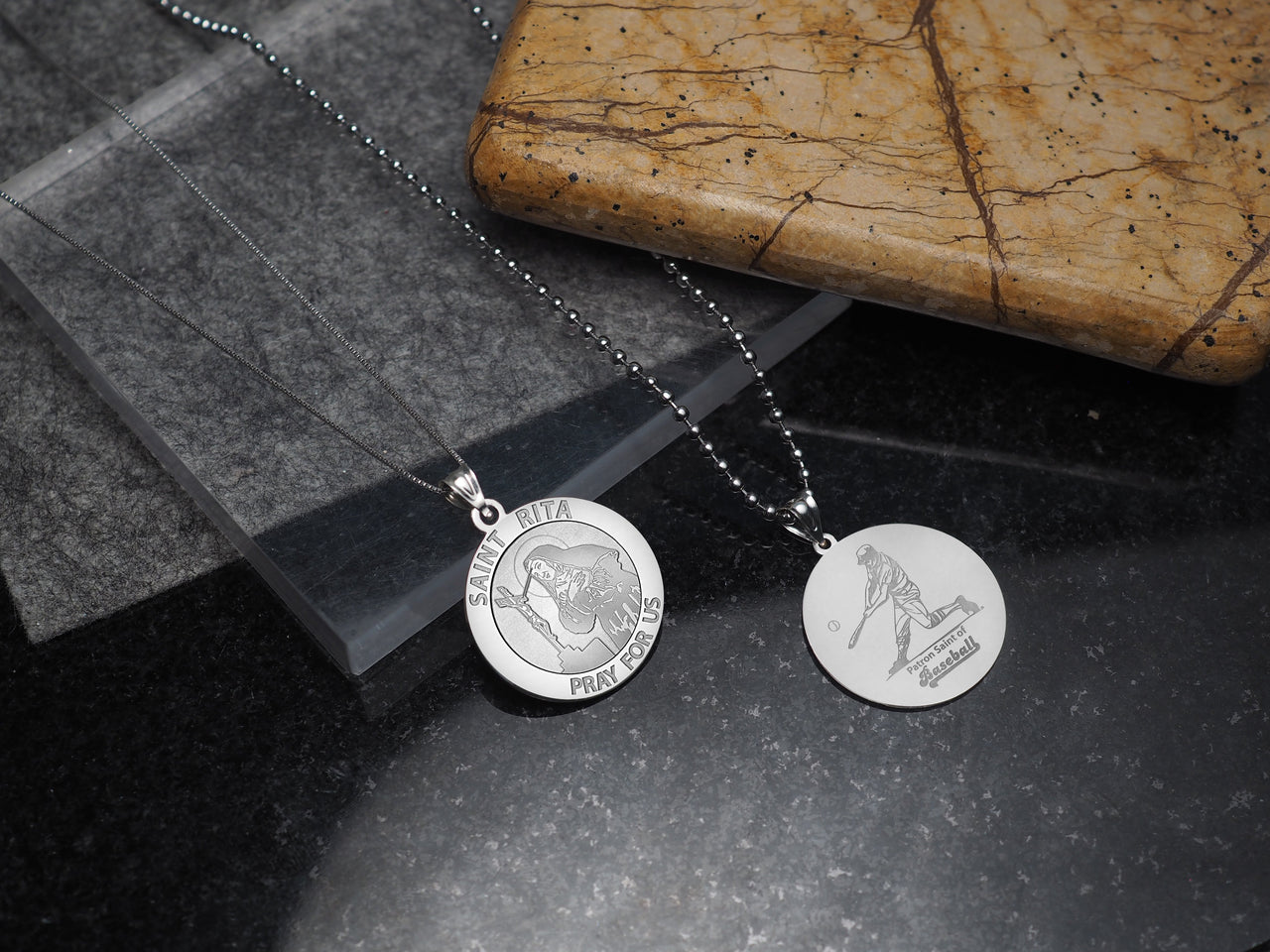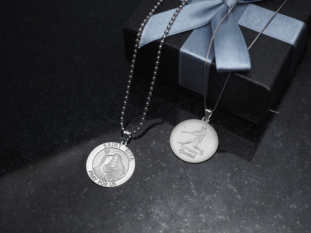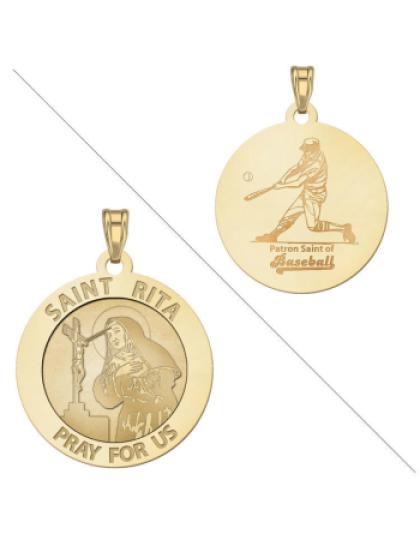 All Religious Medals are Customizable. We can change the spelling, your language, names etc, ex: change "Pray for Us" to "Pray For Me". Just let us know in "special instructions"Recently, St. Rita has been referred to as the patron saint of baseball, due to the several references made to her in the Walt Disney movie The Rookie, in which the chances of Dennis Quaid's character of playing professional baseball is considered a lost cause. This has sparked a small movement in Roman Catholic baseball circles of considering St. Rita the patron saint of the sport: in support of the connection religious medals have been printed with an image of St. Rita on one side and a batter on the other. St. Rita was born at Roccaporena near Spoleto, Umbria, Italy. She married at age 12 to Paolo Mancini. Her parents arranged her marriage, despite the fact that she repeatedly begged them to allow her to enter a convent. Mancini was a rich, quick-tempered, immoral man, who made many enemies in the region. St. Rita endured his insults, abuse, and infidelities for 18 years, and bore two sons with Mancini, Giangiacomo Antonio and Paolo Maria. Although she tried to raise them with Catholic values, her sons grew to be like their father. Toward the end of her husband's life, St. Rita helped convert him to live in a more pious manner. Although Mancini became more congenial, his allies betrayed him, and he was violently stabbed to death. Before his death, he repented to St. Rita and the Church, and she forgave him for his transgressions against her. After Mancini's murder, her sons wished to exact revenge on their father's murderers. Knowing murder was wrong, she tried to persuade them from retaliating, but to no avail. She, instead, prayed to God for Him to take away the lives of her sons instead of seeing them commit such a terrible sin. In religious hist
