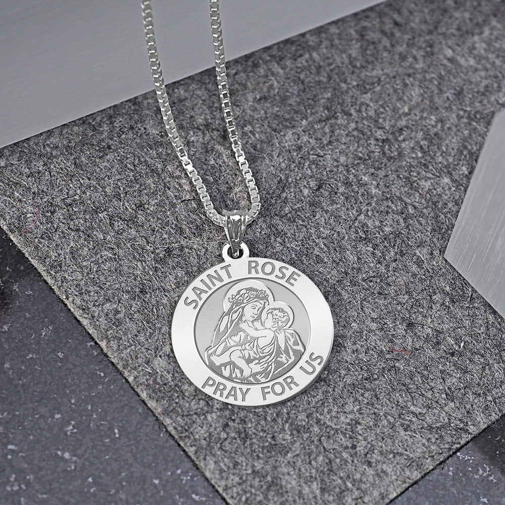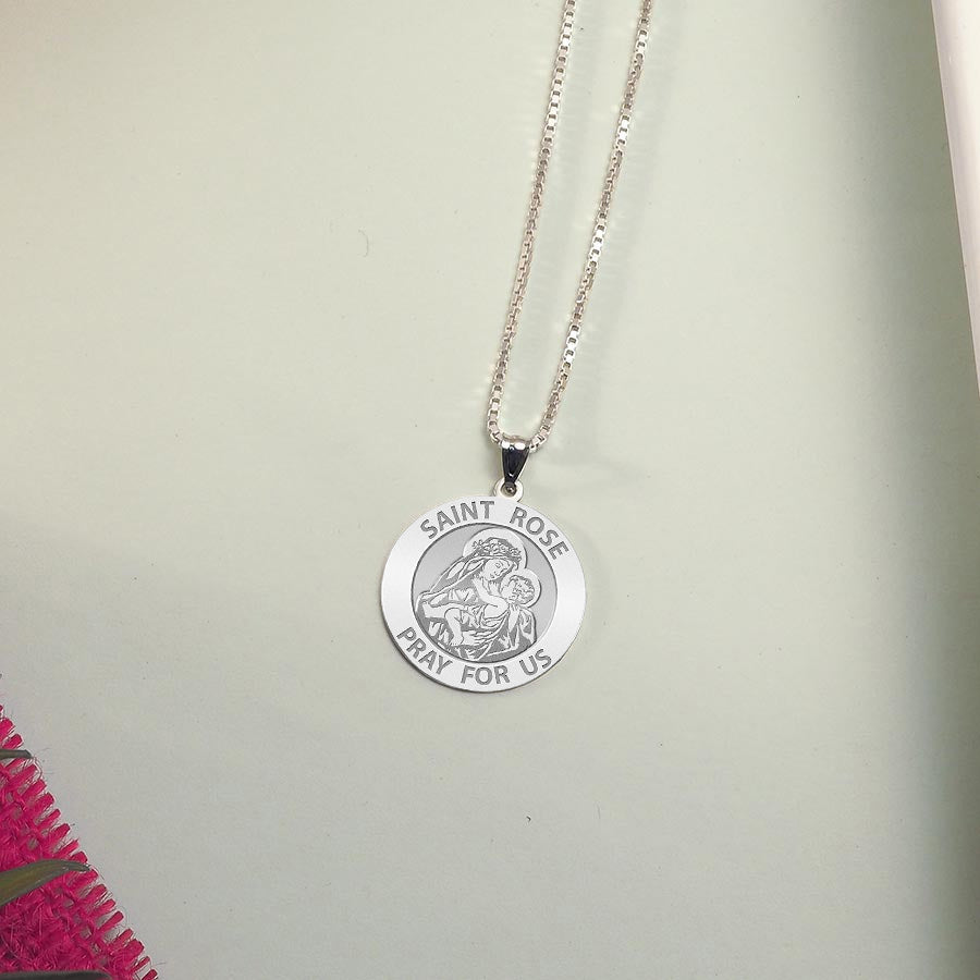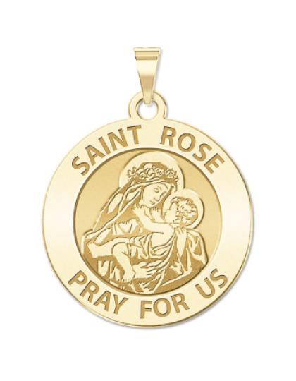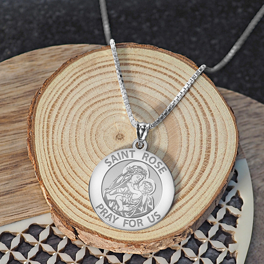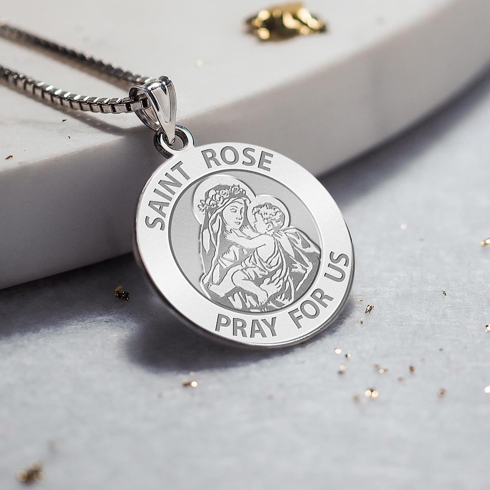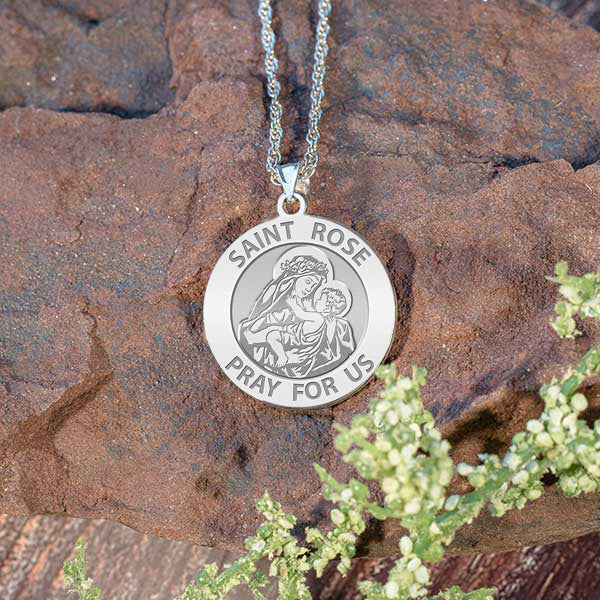 All Religious Medals are Customizable. We can change the spelling, your language, names etc, ex: change "Pray for Us" to "Pray For Me". Just let us know in "special instructions"Rose was born in Lima, Cordal, the capital of the Viceroyalty of Peru. She received the baptismal name Isabel Flores de Oliva. She was from a large family. Her father, Gaspar Flores, was a Spanish harquebusier (soldier armed with a small-caliber long gun), and her mother, Maria de Oliva, was born in Lima. She was personally confirmed by the Archbishop of Lima, Turibius de Mongrovejo. Her nickname "Rosa" was a testament to her holy ties. When she was a baby, a servant claimed to have seen her face transform into a rose, hence her name, "Rosa". In emulation of Saint Catherine of Siena, she fasted three times a week with secret severe penances. When she was admired, Rose cut off her hair against the objections of her friends and her family. Upon the censure of her parents, Rose disfigured her face with pepper and lye. She was very upset that she was so beautiful, and hurt herself to help others. Rose began to tell of visions, revelations, visitations and voices as her parents deplored her penitential practices more than ever. She spent many hours contemplating the Blessed Sacrament, which she received daily. She determined to take a vow of virginity in opposition to her parents, who wished her to marry. Daily fasting turned to perpetual abstinence from meat. Her days were filled with acts of charity and industry. Rose helped the sick and hungry around her community. She would bring them to her home and take care of them. Rose sold her fine needlework, grew beautiful flowers, and would take them to market to help her family. Her exquisite lace and embroidery helped to support her home, while her nights were devoted to prayer and penance in a little gro