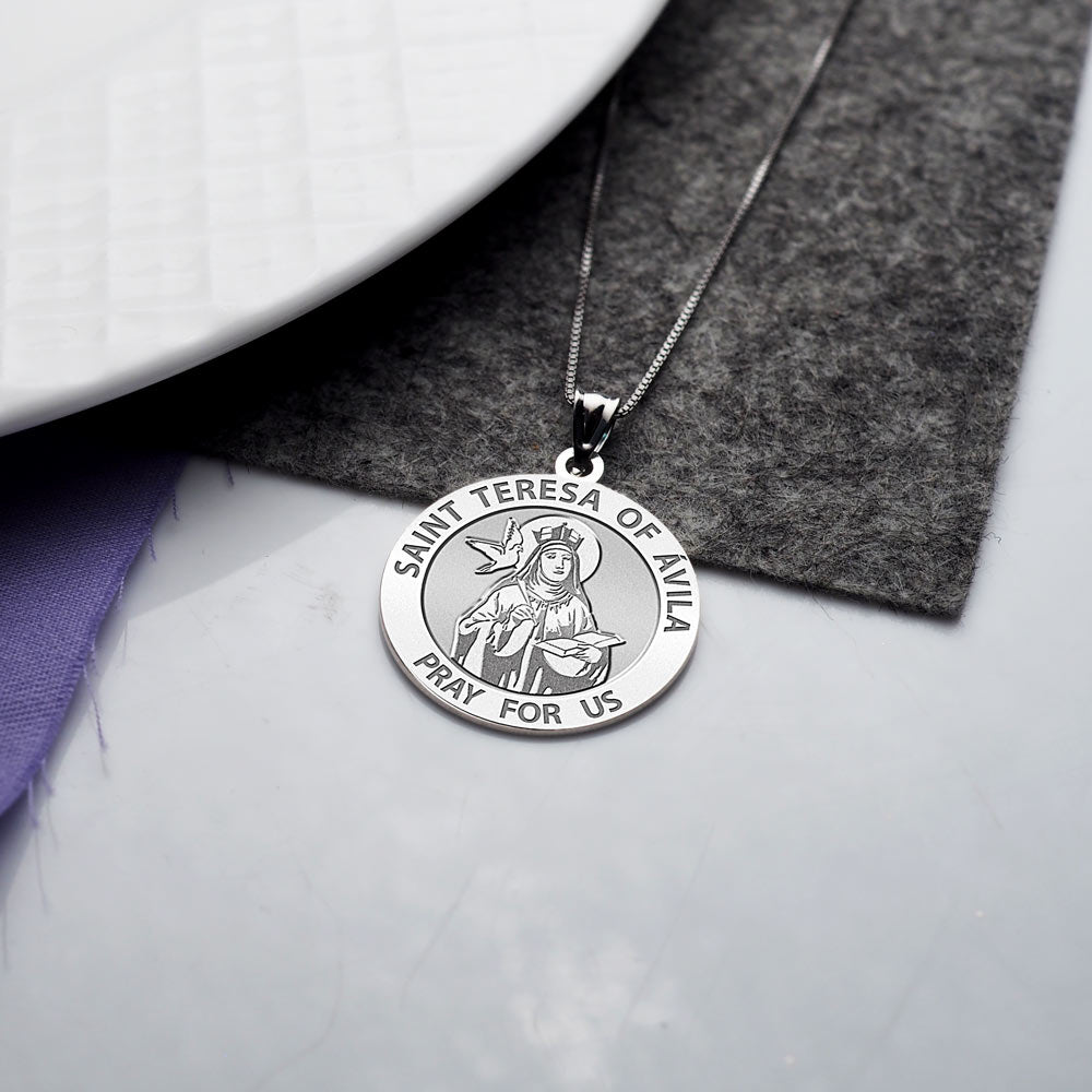 All Religious Medals are Customizable. We can change the spelling, your language, names etc, ex: change "Pray for Us" to "Pray For Me". Just let us know in "special instructions"Saint Teresa of vila was a prominent Spanish mystic, Carmelite nun, and writer of the Counter Reformation. She was a reformer of the Carmelite Order and is considered to be, along with John of the Cross, a founder of the Discalced Carmelites. In 1970 she was named a Doctor of the Church by Pope Paul VI. The kernel of Teresa's mystical thought throughout all her writings is the ascent of the soul in four stages (The Autobiography Chs. 10-22): The first, or "mental prayer", is that of devout contemplation or concentration, the withdrawal of the soul from without and specially the devout observance of the passion of Christ and penitence (Autobiography 11.20). The second is the "prayer of quiet", in which at least the human will is lost in that of God by virtue of a charismatic, supernatural state given of God, while the other faculties, such as memory, reason, and imagination, are not yet secure from worldly distraction. While a partial distraction is due to outer performances such as repetition of prayers and writing down spiritual things, yet the prevailing state is one of quietude (Autobiography 14.1). The "devotion of union" is not only a supernatural but an essentially ecstatic state. Here there is also an absorption of the reason in God, and only the memory and imagination are left to ramble. This state is characterized by a blissful peace, a sweet slumber of at least the higher soul faculties, a conscious rapture in the love of God. The fourth is the "devotion of ecstasy or rapture," a passive state, in which the consciousness of being in the body disappears (2 Corinthians 12:2-3). Sense activity ceases; memory and imagination are also abso