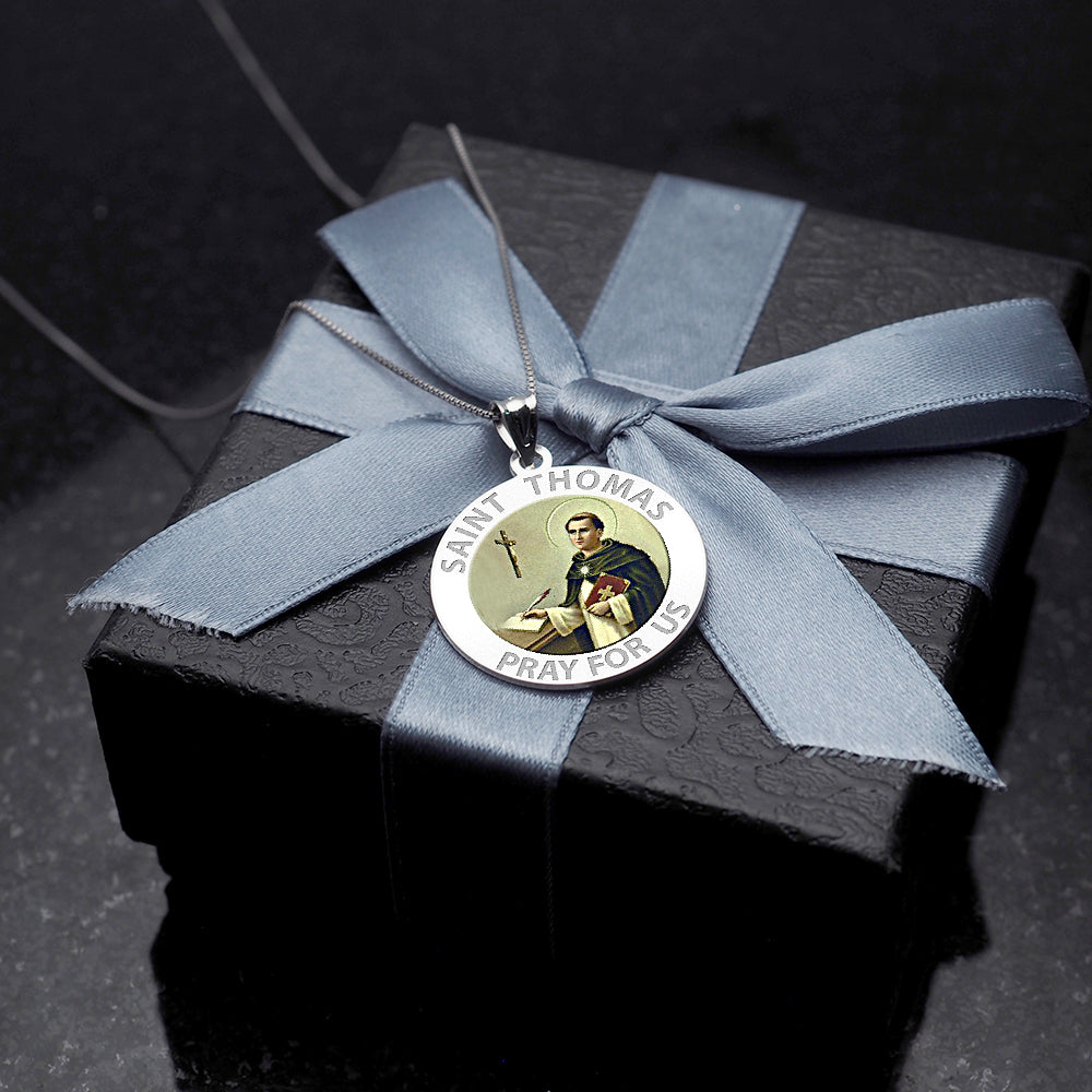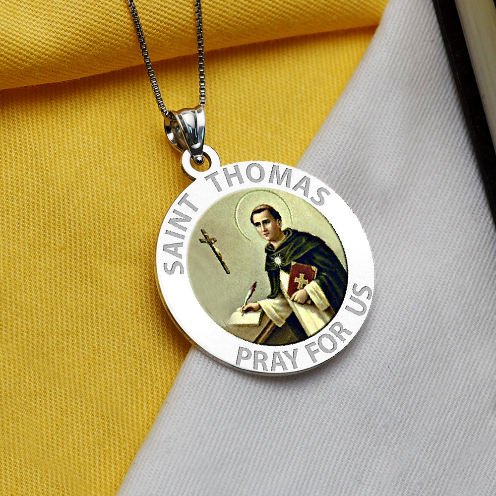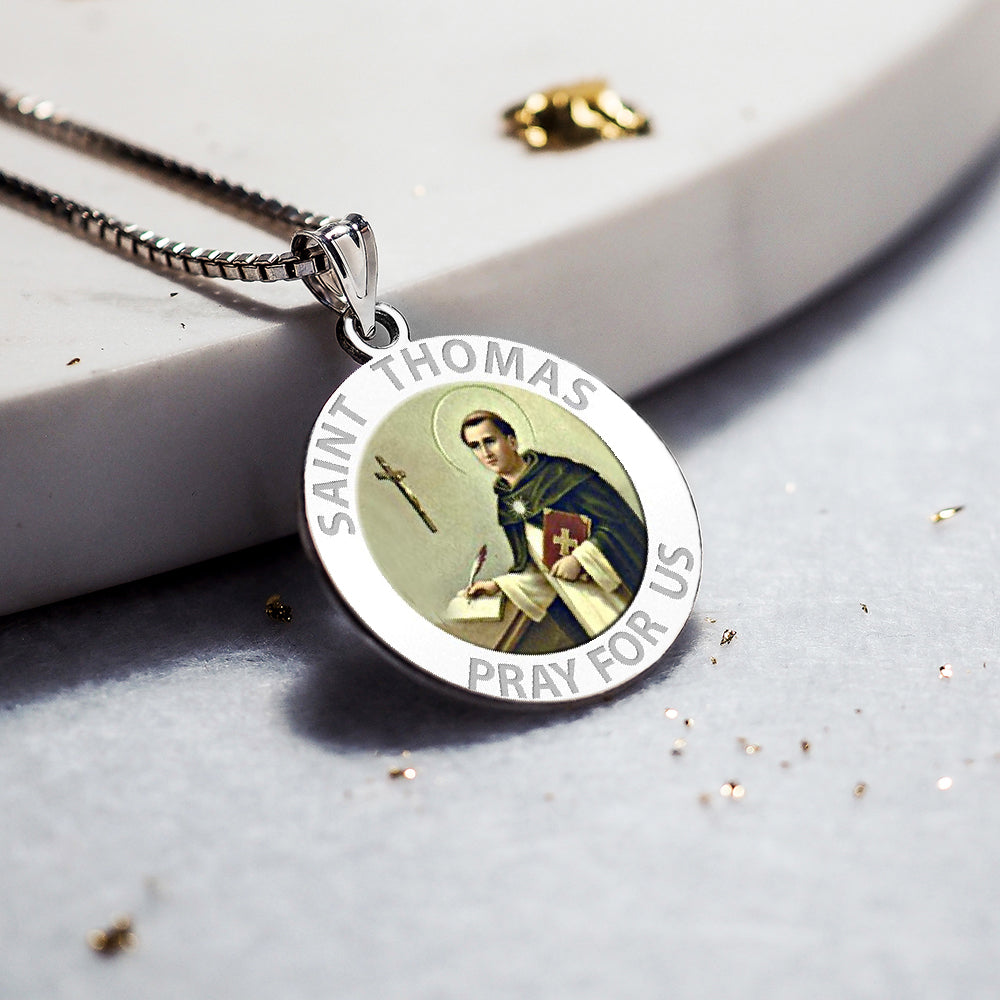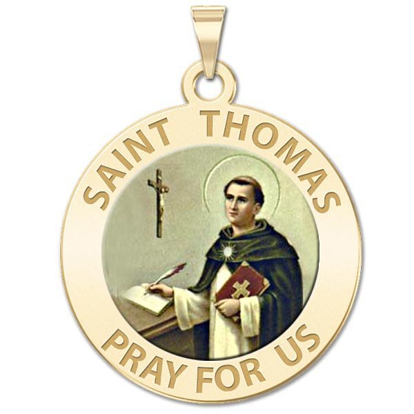 All Religious Medals are Customizable. We can change the spelling, your language, names etc, ex: change "Pray for Us" to "Pray For Me". Just let us know in "special instructions"Color Laser is a patent pending process, color is guaranteed to last foreverColor Medals can be worn in the pool, shower, etc. without affecting the image. We guarantee it.Saint Thomas Aquinas was an Italian Catholic priest in the Dominican Order, a philosopher and theologian in the scholastic tradition, known as Doctor Angelicus, Doctor Universalis and Doctor Communis. He was the foremost classical proponent of natural theology, and the father of the Thomistic school of philosophy and theology. Aquinas is held in the Catholic Church to be the model teacher for those studying for the priesthood. The works for which he is best-known are the Summa Theologica and the Summa Contra Gentiles. One of the 33 Doctors of the Church, he is considered by many Catholics to be the Catholic Church's greatest theologian and philosopher. Consequently, many institutions of learning have been named after him. He is the patron saint of Students, Architects and Builders.
