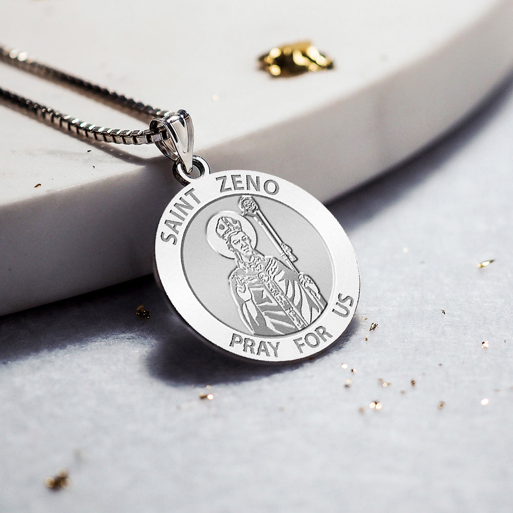 All Religious Medals are Customizable. We can change the spelling, your language, names etc, ex: change "Pray for Us" to "Pray For Me". Just let us know in "special instructions"Zeno of Verona, Italian: Zenone da Verona (about 300 371 or 380) was either an early Christian Bishop of Verona or martyr. He is a saint in the Roman Catholic Church. Zenos liturgical feast day is celebrated on April 12, but in the diocese of Verona, it is also celebrated on May 21, in honor of the translation of his relics on May 21, 807. Tradition states that Zeno built the first basilica in Verona, situated in the area probably occupied by the present-day cathedral. It was rebuilt in the times of Theodoric the Great and in 804 it was said to have been damaged by infidels, perhaps by the Hungarians or Eurasian Avars. The basilica was rebuilt by Bishop Rotaldus and was consecrated on December 8, 806; two local hermits, Benignus and Carus, were assigned the task of translating Zenos relics to a new marble crypt. Pepin the Hunchback, son of Charlemagne, was also present at the ceremony, as were the Bishops of Cremona and Salzburg, as well as an immense crowd of townspeople. The church was damaged again during the end of the 9th century by Hungarians, though the relics of Zeno remained safe.The basilica would be rebuilt again and made much larger and stronger. Financial support was provided by Otto I, and was re-consecrated in 967, a ceremony presided over by the Bishop Raterius of Verona. The Pistoia Cathedral is dedicated to St. Zeno.
