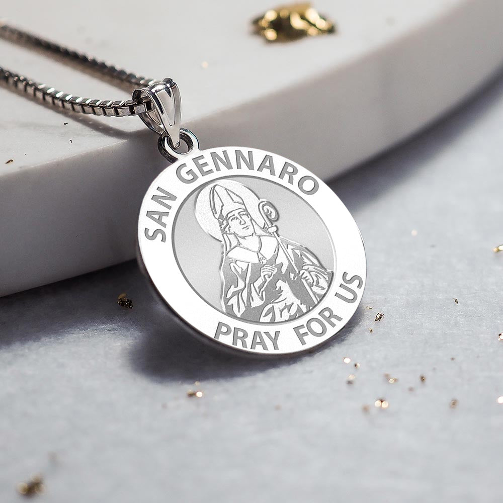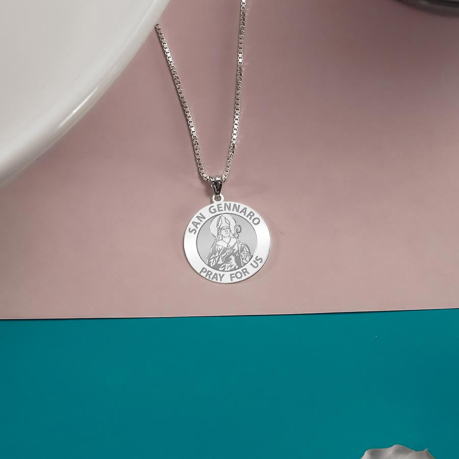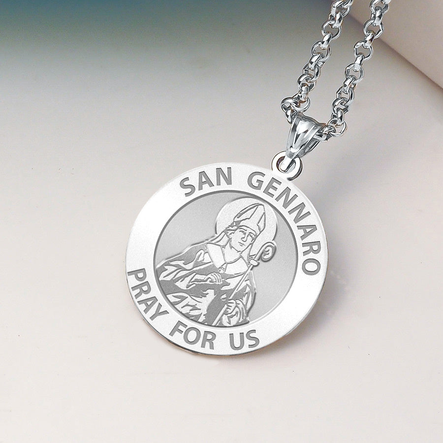 All Religious Medals are Customizable. We can change the spelling, your language, names etc, ex: change "Pray for Us" to "Pray For Me". Just let us know in "special instructions"Saint Januarius, (Italian: San Gennaro), Bishop of Naples, is a martyr saint of both the Roman Catholic and the Eastern Orthodox Churches. He died around the year 305, during the Diocletianic Persecution. He was imprisoned while visiting incarcerated deacons at the sulphur mines of Puteoli, the modern Pozzuoli. After many tortures, including being thrown to lions in Pozzuoli's Flavian Amphitheater, he was beheaded at Solfatara along with his companions, who included Festus (deacon); Desiderius (lector); Sossius; Proculus of Pozzuoli; Acutius; and Euticius. The Feast of San Gennaro, originally a one-day religious commemoration, is now an 11-day street fair beginning on the second Thursday in September in the Little Italy area of Manhattan as an annual celebration of Italian culture and the Italian-American community. His feast day is September 19 in the liturgical calendar of the Roman Catholic Church. The first Feast of San Gennaro was held on September 18, 1926, by newly-arrived Neapolitan immigrants who retained the customary observance from Italy. Similar festivals have also been sponsored in other U.S. cities.