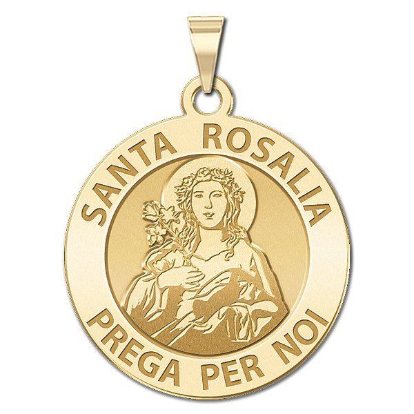 All Religious Medals are Customizable. We can change the spelling, your language, names etc, ex: change "Pray for Us" to "Pray For Me". Just let us know in "special instructions"Saint Rosalia (11301166), also called La Santuzza or "The Little Saint", is the patron saint of Palermo, Sicily, El Hatillo,Venezuela, and Zuata, Anzoategui,Venezuela. According to legend, Rosalia was born of a Norman noble family that claimed descent from Charlemagne. Devoutly religious, she retired to live as a hermit in a cave on Mount Pellegrino, where she died alone in 1166. Tradition says that she was led to the cave by two angels. On the cave wall she wrote "I, Rosalia, daughter of Sinibald, Lord of Roses, and Quisquina, have taken the resolution to live in this cave for the love of my Lord, Jesus Christ." In 1624, a horrible plague haunted Palermo, and during this hardship St Rosalia appeared first to a sick woman, then to a hunter to whom she indicated where her remains were to be found. She ordered him to bring her bones to Palermo and have them carried in procession through the city. The hunter climbed the mountain and found her bones in the cave as described. He did what she had asked in the apparition, and after the procession the plague ceased. After this St Rosalia would be venerated as the patron saint of Palermo, and a sanctuary was built in the cave where her remains were discovered. The celebration, called the festino, is still held each year on July 15. It is still a major social and religious event in Palermo. Also on September 4 there is an event related to the festino and St. Rosalia; a tradition of walking bare foot from Palermo up to Mount Pellegrino. In Italian American communities in the United States, the July feast is generally dedicated to Our Lady of Mount Carmel while the September feast, beginning in August, brings