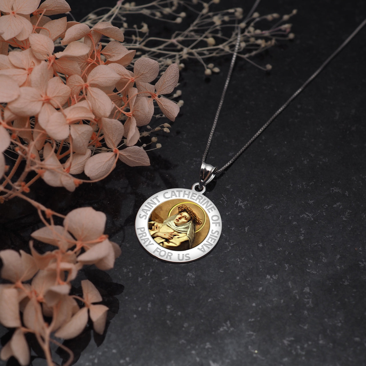 All Religious Medals are Customizable. We can change the spelling, your language, names etc, ex: change "Pray for Us" to "Pray For Me". Just let us know in "special instructions"Saint Catherine of Siena, O.P. (March 25, 1347 April 29, 1380) was a Tertiary of the Dominican Order, and a Scholastic philosopher and theologian. She also worked to bring the Papacy back to Rome from its displacement in France, and to establish peace among the Italian city-states. In about 1366, St Catherine experienced what she described in her letters as a "Mystical Marriage" with Jesus, after which she began to tend the sick and serve the poor. In 1370, she received a series of visions of Hell, Purgatory, and Heaven, after which she heard a command to leave her withdrawn life and enter the public life of the world. Being illiterate, she dictated several letters to men and women in authority, especially begging for peace between the republics and principalities of Italy and for the return of the Papacy from Avignon to Rome. She carried on a long correspondence with Pope Gregory XI, also asking him to reform the clergy and the administration of the Papal States. St Catherine died of a stroke in Rome, the spring of 1380, at the age of thirty-three. The people of Siena wished to have her body. There is a myth that explains how Catherine's head was able to get to Siena, where it has been entombed in the Basilica of San Domenico. The people of Siena knew they could not get her whole body past Roman guards and decided to take only her head which they placed in a bag. They were still stopped by guards and they prayed to St Catherine to help them because they knew Catherine would rather be in Siena. When they opened the bag to show the guards, it no longer held her head, but was full of rose petals. Once they got back to Siena they reopened the bag and her