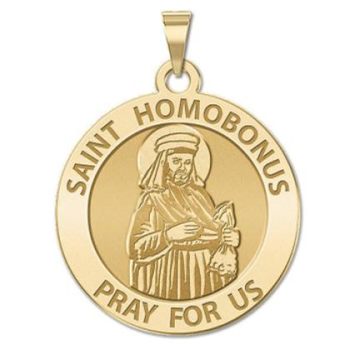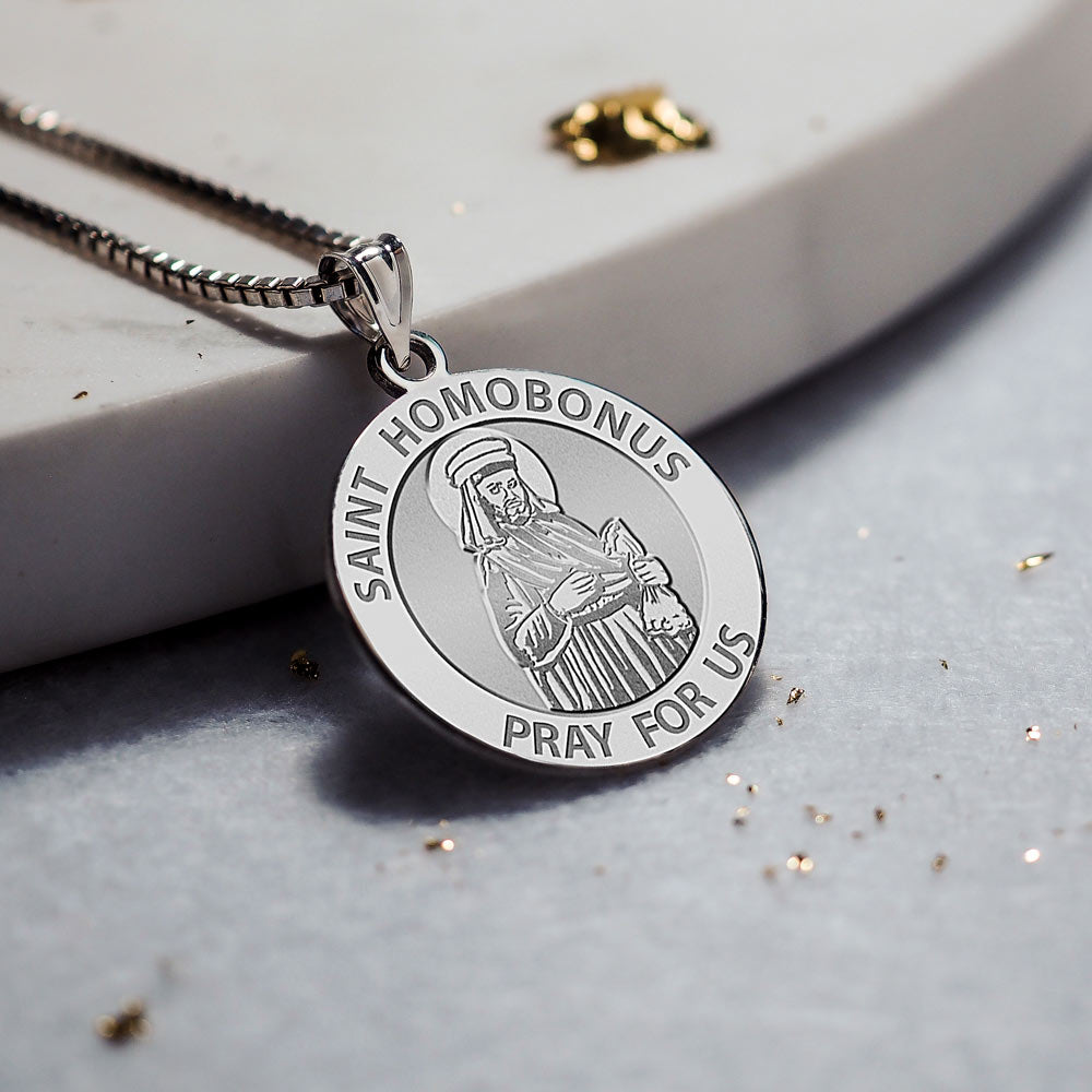 All Religious Medals are Customizable. We can change the spelling, your language, names etc, ex: change "Pray for Us" to "Pray For Me". Just let us know in "special instructions"Saint Homobonus (Italian: Sant'Omobono, German: Sankt Gutman) is the patron saint of business people, tailors, shoemakers, and clothworkers, as well as of Cremona, Italy. He was canonized in 1199 at the urgent request of the citizens of Cremona. He died on November 13, 1197 and his feast day is celebrated on November 13. He was a merchant from Cremona, northern Italy. Born Omobono Tucenghi, he was a married layman who believed that God had allowed him to work in order that he would be able to support people that were living in a state of poverty. His name is derived from the Latin homo bonus ("good man"). Homobonus was able to pursue this calling in life easily as a result of the inheritance he received from his father, a prosperous tailor and merchant. He practiced his business at Cremona with scrupulous honesty. He also donated a large proportion of his profits to the relief of the poor. Homobonus was a frequent church attendee that would partake in the Eucharist everyday. While attending mass, prostrated in the form of a cross, on November 13, 1197, Homobonus died. Two years later Homobonus was canonized by Pope Innocent III. During Homobonus's canonization Pope Innocent III said that Homobonus was a "father of the poor", "consoler of the afflicted", "assiduous in constant prayer", "man of peace and peacemaker", "a man good in name and deed", "this saint, is still like a tree planted by streams of water that yields its fruit in our time." The church of Sant'Omobono in Rome is dedicated to him.