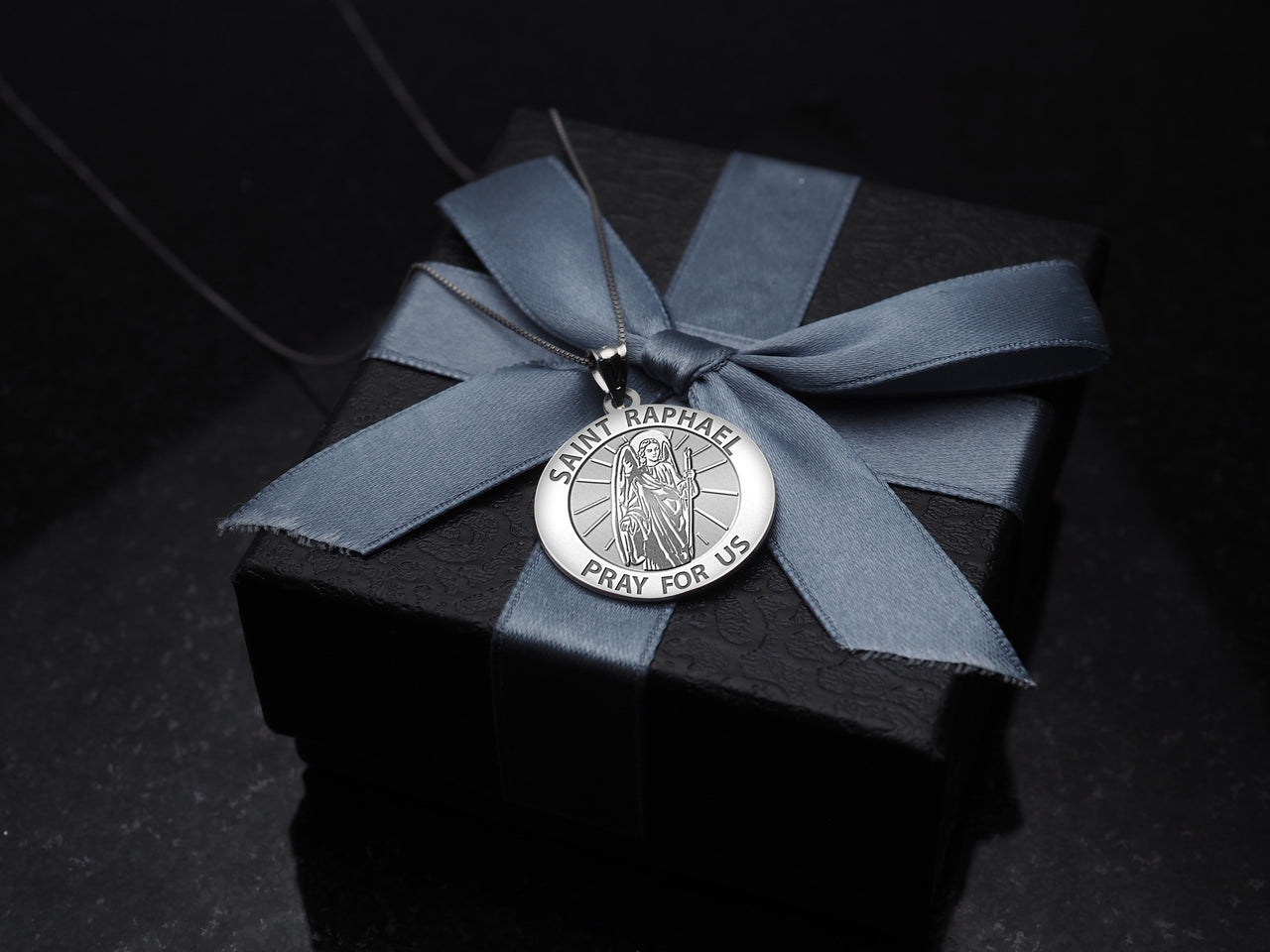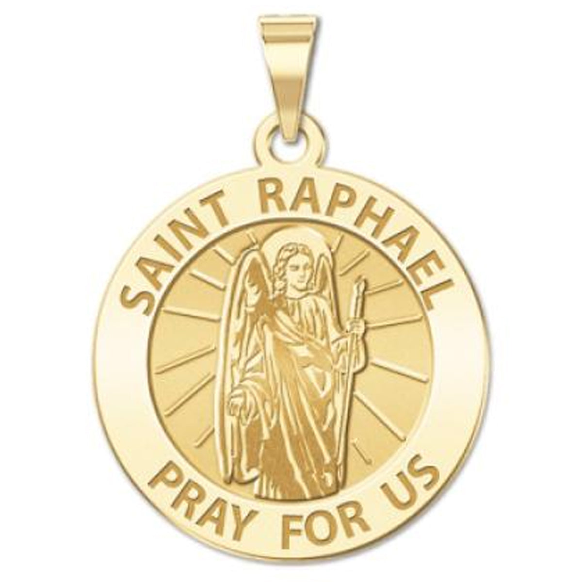 All Religious Medals are Customizable. We can change the spelling, your language, names etc, ex: change "Pray for Us" to "Pray For Me". Just let us know in "special instructions"The name of the archangel Raphael appears in the Deuterocanonical Book of Tobit. The Book of Tobit is considered canonical by Roman Catholic, Orthodox and some Protestant Christians. Raphael first appears disguised in human form as the travelling companion of the younger Tobias, calling himself "Azarias the son of the great Ananias". During the adventurous course of the journey the archangel's protective influence is shown in many ways including the binding of the demon in the desert of upper Egypt. After the return and the healing of the blindness of the elder Tobias, Azarias makes himself known as "the angel Raphael, one of the seven, who stand before the Lord" Tobit 12:15. Compare the unnamed angels in John's Revelation 8:2. Regarding the healing powers attributed to Raphael, we have little more than his declaration to Tobit (Tobit, 12) that he was sent by the Lord to heal him of his blindness and to deliver Sarah, his daughter-in-law, from the devil (Asmodeus) that was the serial killer of her husbands. Among Catholics, he is considered the patron saint of medical workers and matchmakers, and may be petitioned by them or those needing their services. Among Roman Catholics, Eastern Orthodox and some Protestant Christians Saint Raphael's feast day is kept on 29 September, along with that of Saint Michael and Saint Gabriel. Raphael was included for the first time in the Roman Catholic calendar of saints in 1921, for celebration on 24 October. This continued until 1969, when 29 September became the day for the joint celebration of the three archangels. He is patron saint of against nightmares; apothecaries; blind people; bodily ills; doctors; drugg