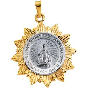 - This 14k White and Yellow Gold Miraculous Medal is the most popular selling medal. This medal represents when the Virgin Mother appeared to a nun (now Saint) and showed her this exact medal, front and back. The back Features an M surmounted by a cross with two hearts and twelve stars.