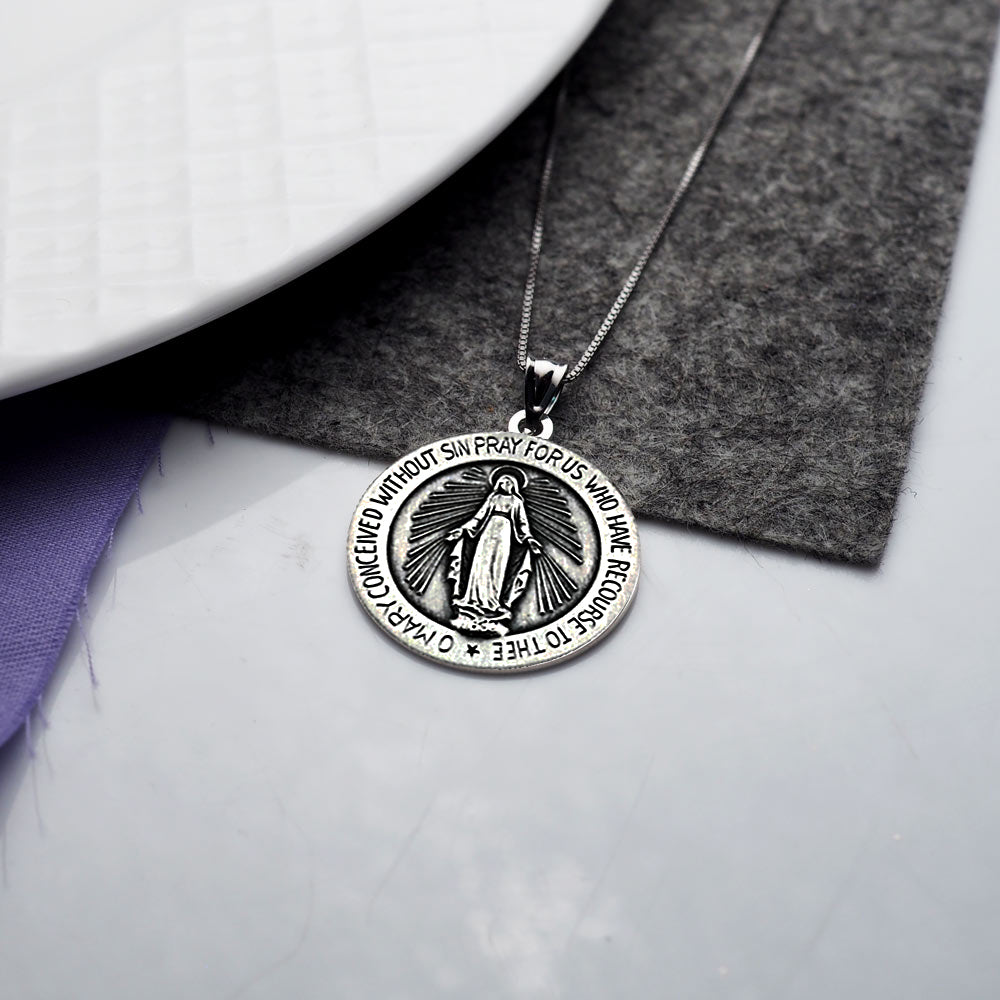 • This Solid 14K Gold medal was created after a nun (now Saint) was given a vision of this exact medal front and back. The back features an "M" surmounter by an cross with two hearts and tweleve stars. This is the most popular selling medal of all.