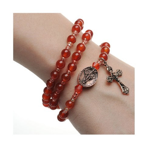 - 6MM GENUINE RED AGATE BEADS MAKE UP THIS FULL ROSARY STRETCH BRACELET. THE BRACELET WHEN OFF THE WRIST IS A FULL ROSARY TO PRAY ON.