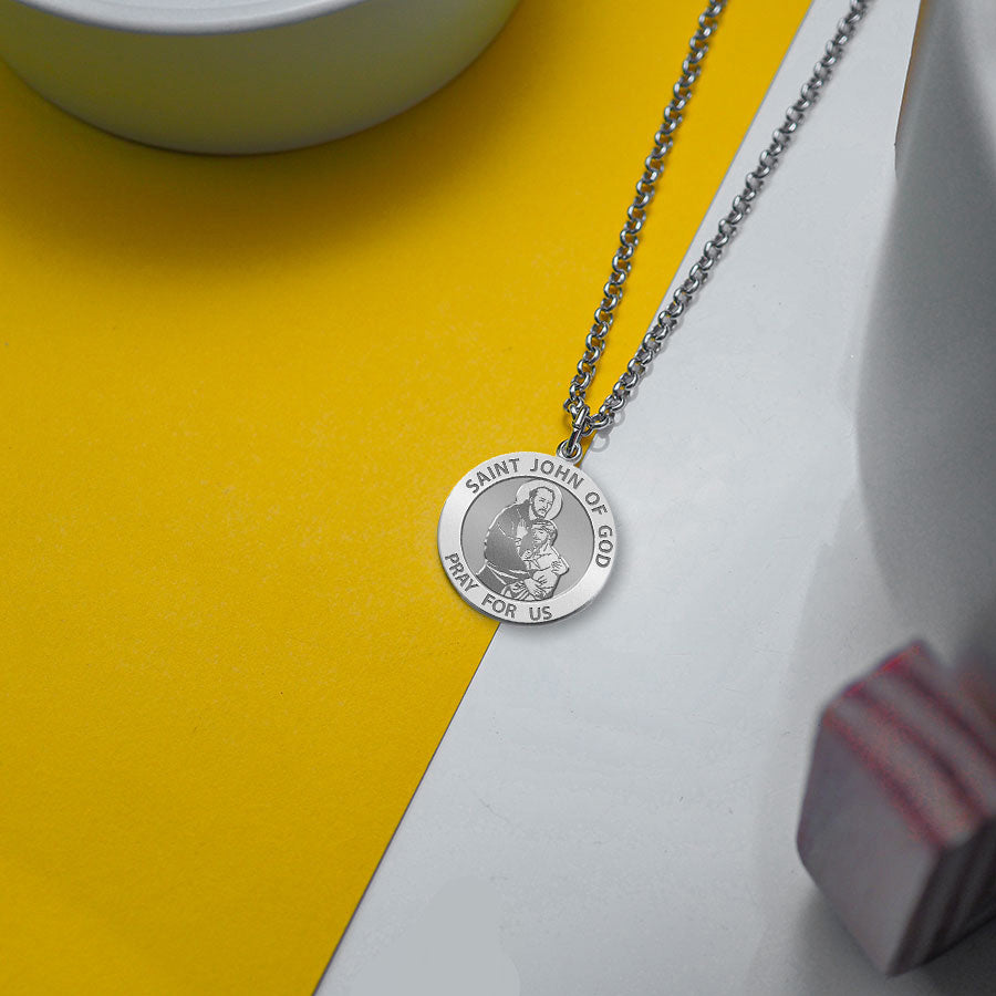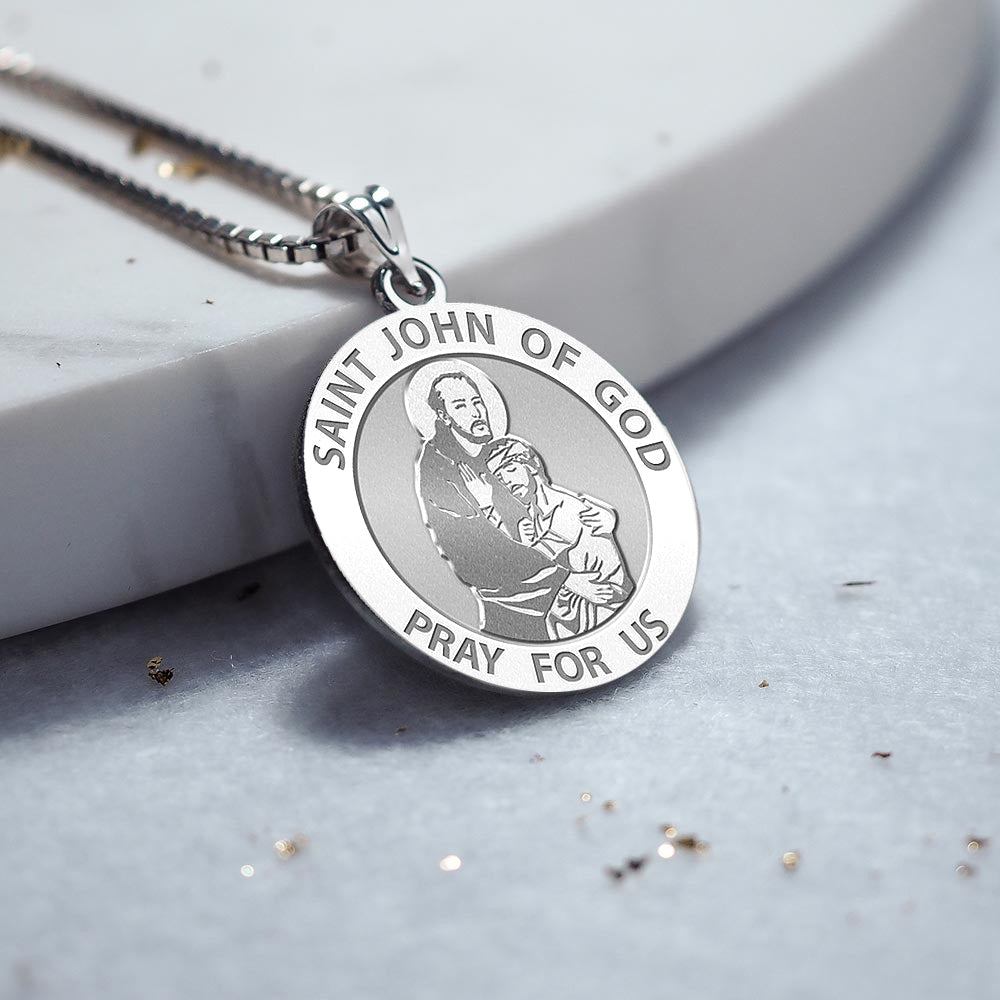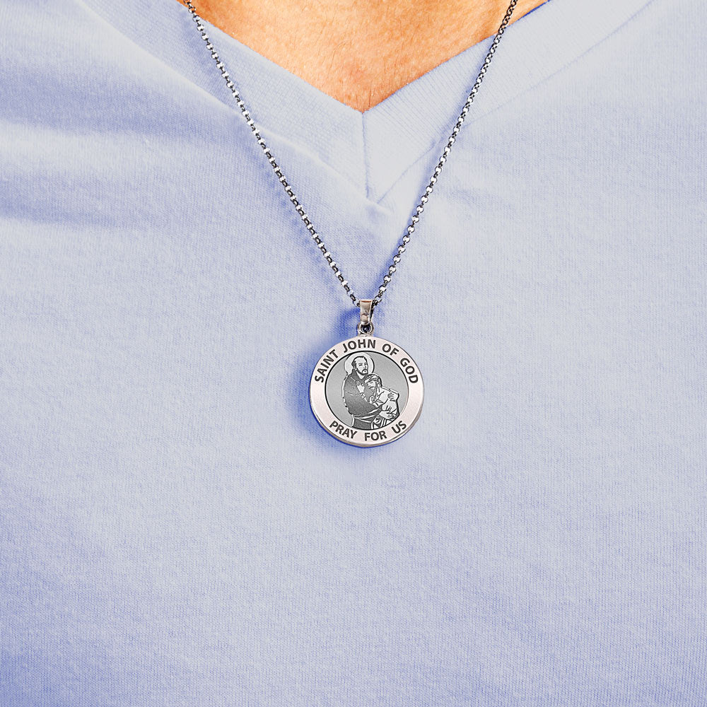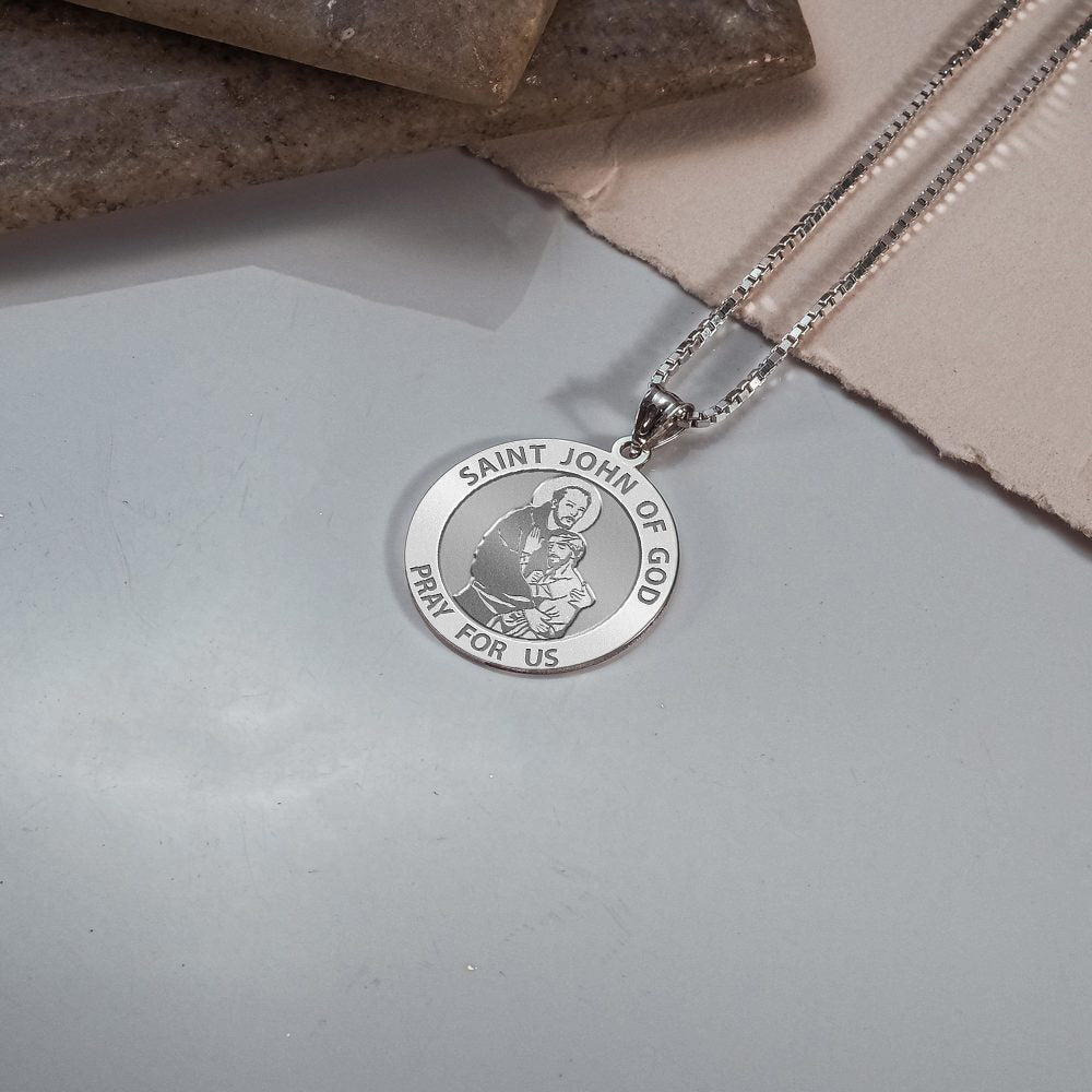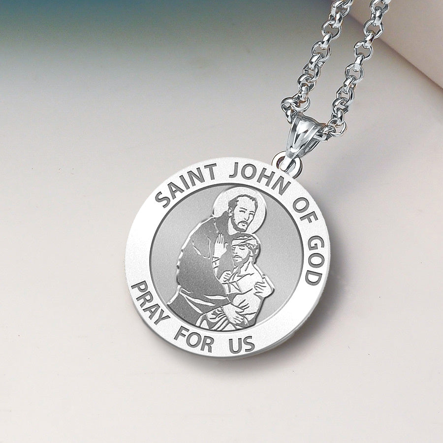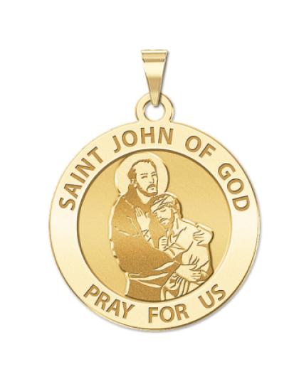 All Religious Medals are Customizable. We can change the spelling, your language, names etc, ex: change "Pray for Us" to "Pray For Me". Just let us know in "special instructions"Saint John of God (Spanish: San Juan de Dios; Portuguese: So Joo de Deus; March 8, 1495 March 8, 1550) was a Portuguese-born friar and saint, who has become one of Spain's leading religious figures. St. John of God was born Joo Cidade in Montemor-o-Novo, Portugal, into a once prominent family that was impoverished but had great religious faith. His mother died when he was only a small child, and his father joined a monastic order. As a young man, St. John worked as a shepherd for a farmer, who was very pleased with his strength and diligent work. John had an offer to marry the farmer's daughter and become heir to the property; he refused because he wanted to pursue a spiritual life in the name of the Lord. He moved to Spain, where he served as a heroic soldier under the Holy Roman Emperor Charles V and fought in a few battles. After many heroic exploits, he worked disseminating religious books, using the recent Gutenberg moveable-type printing press to provide people with the word of the Lord. He experienced a major spiritual conversion on Saint Sebastian's day (January 20), while listening to a sermon by Saint John of vila, the man who was later to become his spiritual mentor and would encourage him in his quest to improve the life of the poor. He then went temporarily into what appeared to be a state of madness brought on by the Lord and was subsequently thrown into the madhouse, where he recovered after a visit from Blessed John of vila and realized that the poor and needy deserved better treatment than he had received. He decided to devote the rest of his life to caring for the sick and the poor. Settling in Granada, Spain, he expended all of his