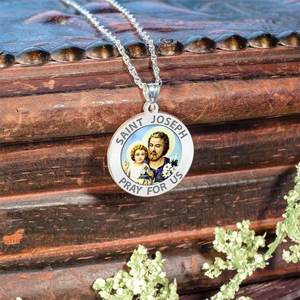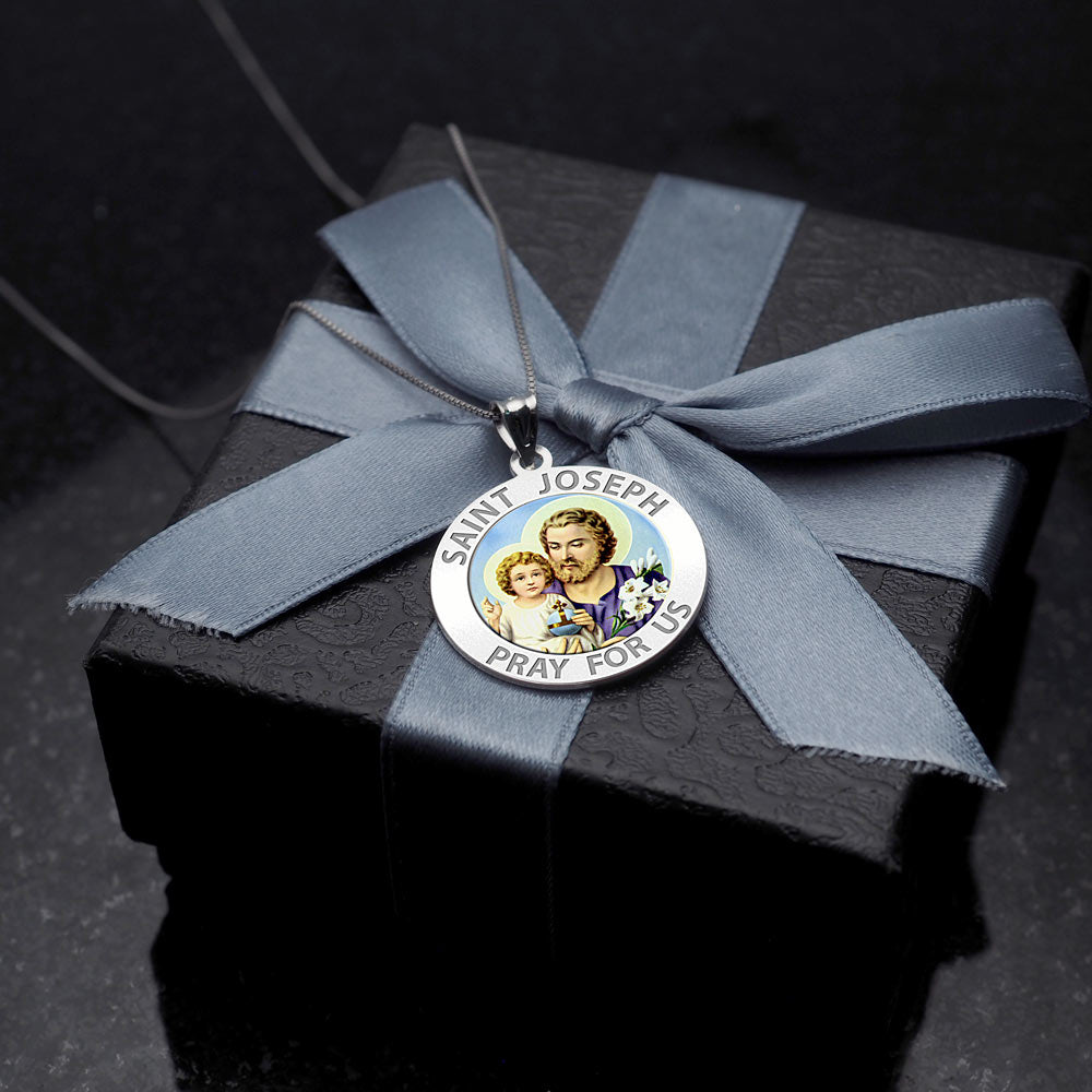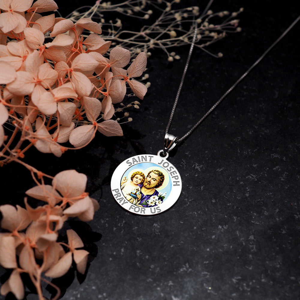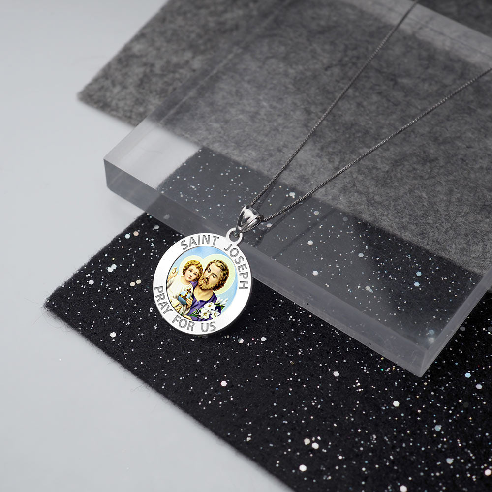 All Religious Medals are Customizable. We can change the spelling, your language, names etc, ex: change "Pray for Us" to "Pray For Me". Just let us know in "special instructions"Color Laser is a patent pending process, color is guaranteed to last foreverColor Medals can be worn in the pool, shower, etc. without affecting the image. We guarantee it.Saint Joseph is known from the New Testament as the husband of Mary and although according to most Christian traditions he was not the biological father of Jesus of Nazareth, he acted as his foster-father and as head of the Holy Family. Joseph is venerated as a saint within the Roman Catholic, Eastern Orthodox, and Anglican churches. In the Roman Catholic and other traditions, Joseph is the patron saint of workers and has several feast days. He was also declared to be the patron saint and protector of the universal Catholic Church (along with Saint Peter) by Pope Pius IX in 1870, and is the patron of several countries and regions. He is a rare example of a saint from the early days of the church whose devotional role has tended to increase in the centuries since the Middle Ages.