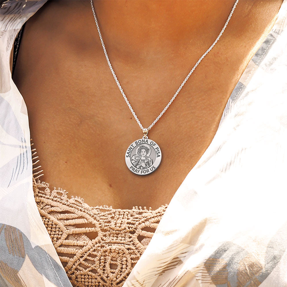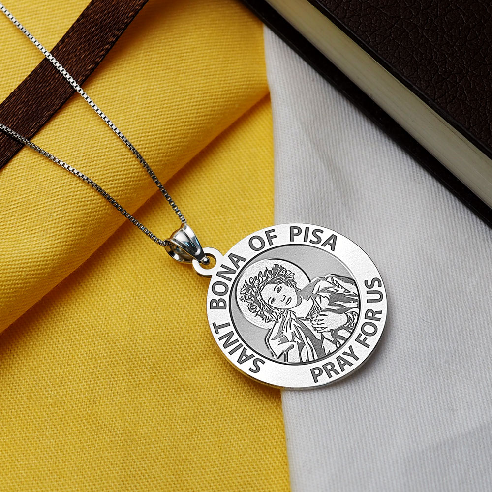 All Religious Medals are Customizable. We can change the spelling, your language, names etc, ex: change "Pray for Us" to "Pray For Me". Just let us know in "special instructions"Bona of Pisa (c. 1156 1207) was a nun who helped lead travellers on pilgrimages. She was later canonized a saint by the Roman Catholic Church. Her feast day is celebrated on May 29. She is also regarded as a patron saint of travelers, and specifically couriers, guides, pilgrims, flight attendants, and the city of Pisa.